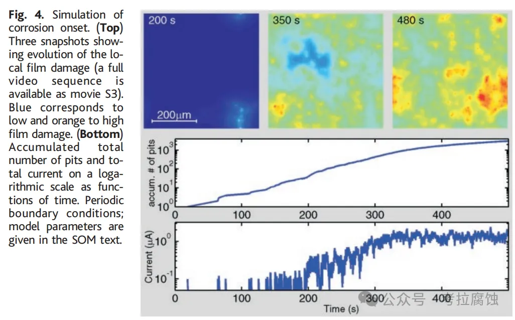 图4显示了模型的数值模拟(模型方程和参数值见SOM文本)。虽然模型是现象学的,并基于若干简化,但它确实解释了观察到的突然腐蚀发作特征。从初始钝态开始,一些单个点蚀独立成核,并开始快速点蚀复制,将表面带到高活性。累积总点蚀数量和电流的时间演化在对数尺度下显示。点蚀数量的指数增长显而易见。模拟中的特征时间和长度尺度,以及点蚀密度,与实验观察一致。