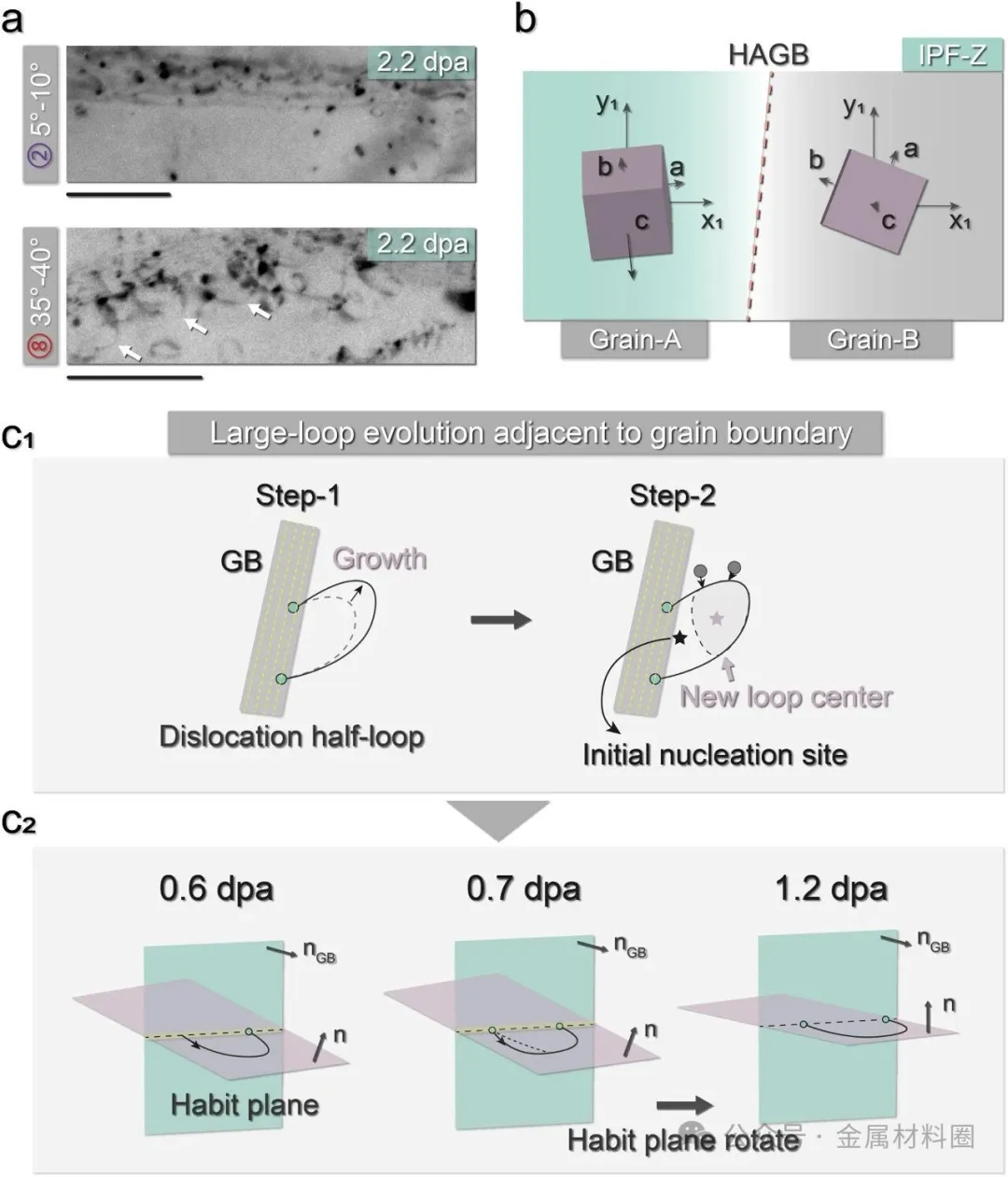 图2:系统研究了不同取向差晶界处位错环形核的辐照剂量窗口。图2a-c分别展示了取向差为1-5°、5-10°和10-15°的晶界附近位错环的原位演化过程,证实了形核阈值的存在。图2d总结了不同取向差晶界处位错环形核与辐照剂量的关系图,明确指出位错环在晶界处的形成不仅与取向差相关,也与辐照剂量紧密相关。