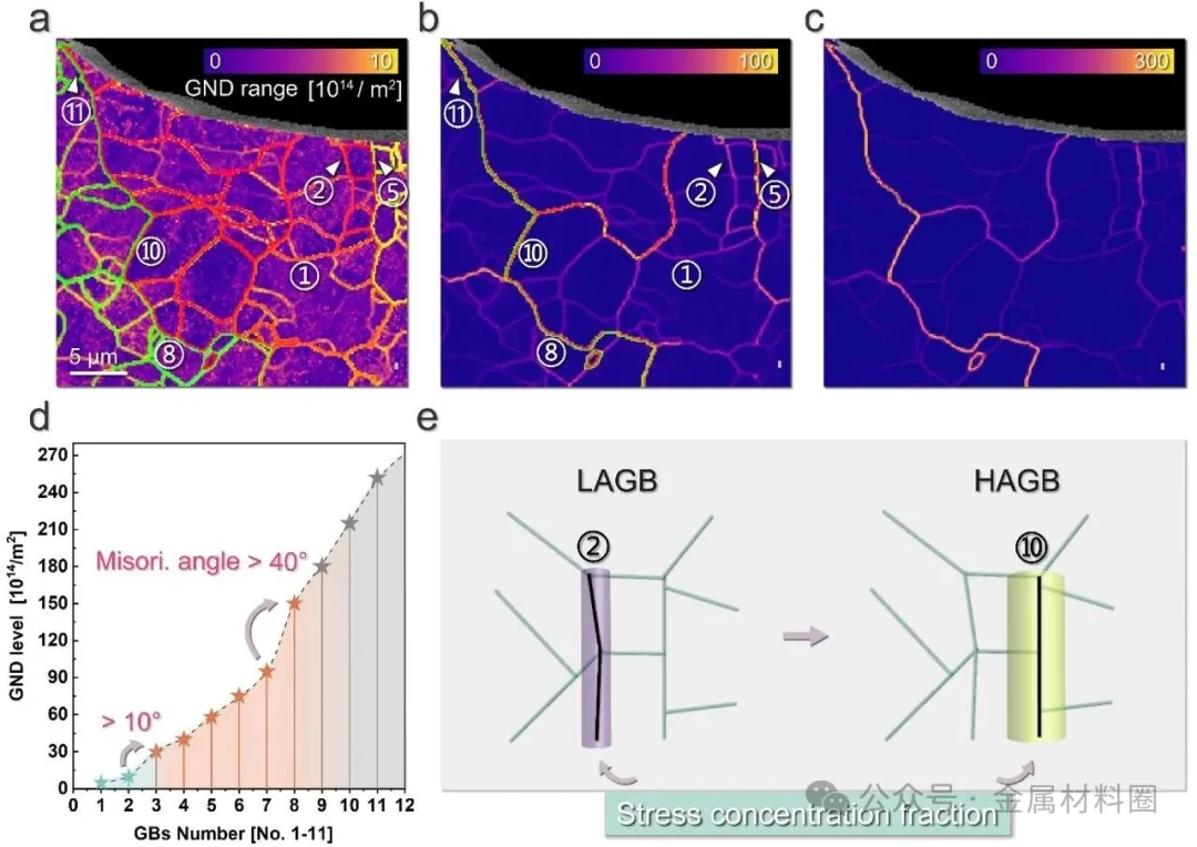图3:分析了位错环在五个高角度晶界(>15°)附近的生长行为。图3a-d追踪了每个晶界附近多个标记单环的尺寸随剂量的演化,统计显示较大取向角的晶界出现大尺寸环的频率更高,生长速率也更快。图3e和3f则统计了相同区域内(包含一个晶界)位错环的平均尺寸和数密度随剂量的变化,揭示了环的尺寸增长与数密度增加之间的竞争关系。图4:通过改变衍射条件,验证了辐照诱导位错环确实位于晶界上。图4a显示当晶界处于刃型状态、完全展宽等不同形态时,位错环均随机分布在晶界上。图4b原位展示了晶界上位错环典型的生长和合并过程。图4c跟踪了图4b中几个标记环的尺寸变化,表明即使在晶界区域,位错环之间仍可发生合并。图5:对比了低角度与高角度晶界附近缺陷贫化区的差异。图5a和b的弱束暗场像清晰地显示了基体中小尺寸缺陷簇的存在,再次证明了位错环在晶界处的优先形成。图5c和d显示在1.2 dpa时,1-5°的低角度晶界附近存在缺陷贫化区,而高角度晶界(GB-11)右侧则没有明显的贫化区。图5e和f进一步说明了低角度晶界附近的缺陷贫化区宽度随辐照剂量增加而变窄的趋势。图6:将本研究观察到的缺陷贫化区宽度数据与文献中报道的不同晶体结构金属及合金的数据进行了对比分析。结果表明,贫化区的形成与材料晶体结构无关,但本研究中发现取向角超过25°的晶界表现出完全的贫化区抑制,凸显了晶界宏观与微观状态依赖的辐照损伤容忍度。图7:通过几何必要位错密度图和示意图,分析了晶界取向差与应力集中的关系。图7a-c显示了标记的低角度和高角度晶界区域典型的应变水平。图7d表明GND密度随晶界取向角增加呈非线性增长,在10°和40°附近出现跃升。图7e示意图表明,高角度晶界区域具有更扩展的应力集中分数,能提供更宽的应力梯度驱动自间隙原子向晶界输运。图8:利用几何相位分析法获得了典型低角度和高角度晶界在辐照前的应变分布。图8a和d分别为过滤后的低角度和高角度晶界高分辨像的逆傅里叶变换图。图8b-f展示了通过GPA提取的应变(sxy)分布图及对应的线扫描曲线。结果表明,高角度晶界区域的应变波动范围更大,这与更高的应力集中状态相符。图9:通过建模和示意图阐述了晶界特性对缺陷优先形核的机理。图9a示意图描述了自间隙原子扩散模式与距晶界距离的关系。图9b基于Arrhenius公式估算了373 K下不同取向差晶界处的原子扩散系数,显示高角度晶界的扩散速率比低角度晶界高1-2个数量级。图9c-d和e示意图综合了扩散机制和晶界特性的影响,分阶段(优先形核、形成位错网络、作为二次缺陷阱)阐释了不同辐照阶段晶界处位错环分布模式的控制机制。图10:重点讨论了辐照诱导的位错半环演化及其与晶界的相互作用。图10a展示了在2.2 dpa下,不同晶界(GB-2和GB-8)处的位错形态差异。图10b给出了存在大型位错半环的高角度晶界两侧晶粒的取向关系。图10c1-c2示意图描绘了紧邻晶界的位错半环形成、生长以及其滑移面随辐照剂量发生旋转的过程。图11:通过示意图总结了低角度与高角度晶界附近缺陷聚集和贫化区形成过程的差异。图11a和b示意性地对比了在低角度和高角度晶界邻近区域,随着辐照剂量增加(Dose-1至Dose-3),位错环形核、生长、形成网络,并最终影响贫化区特征的不同路径。