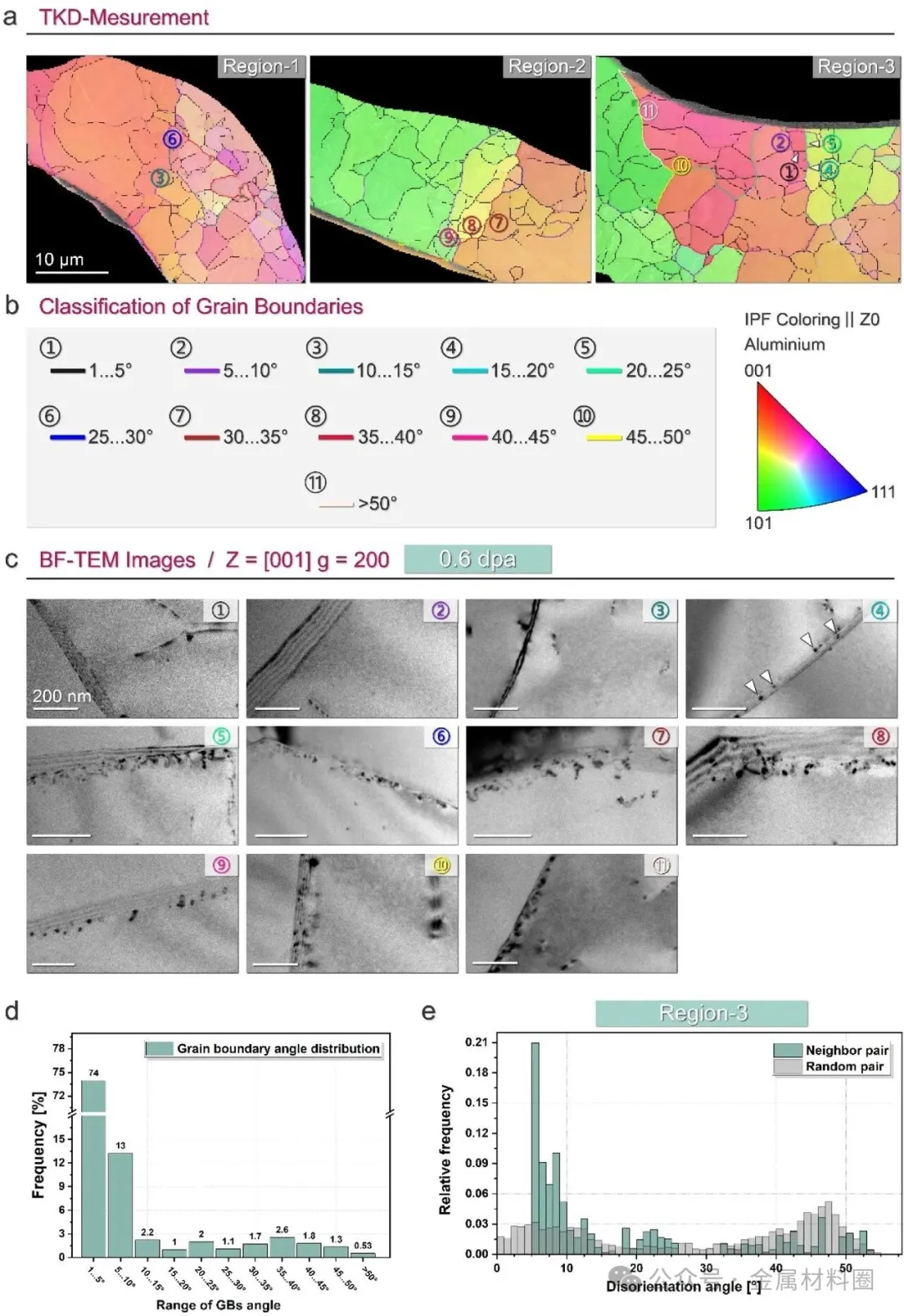 图1:展示了未辐照样品的晶界取向差表征与分类结果。图1a为通过透射菊池衍射获得的带衬度图,显示了三个待研究区域的晶界。图1b将1°至>50°的取向差以5°为间隔分为11类并用不同颜色标示。图1c清晰地显示,在0.6 dpa剂量下,位错环显著聚集在取向角大于15°的晶界附近,而小于15°的晶界仅可见短位错线衬度。图1d和1e统计了样品中不同角度晶界的频率以及典型观察区域的晶粒取向差分布,表明低角度晶界在样品中占比最大。