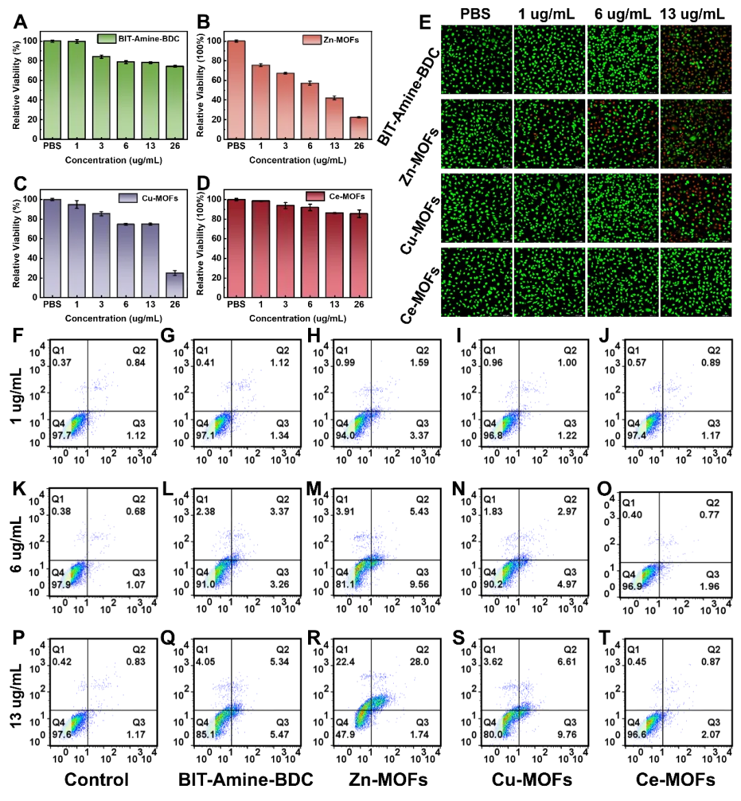 1. BIT-Amine-BDC 配体及 M-MOFs 的制备首先,通过Mannich反应,将商业化抗菌剂1,2-苯并异噻唑啉-3-酮(BIT)接枝到2-氨基对苯二甲酸上,合成具有本征抗菌活性的新型配体BIT-Amine-BDC。随后,将该配体分别与Zn²⁺、Cu²⁺、Ce³⁺金属离子进行溶剂热反应,自组装构建系列M-MOFs(M=Zn, Cu, Ce)抗菌材料。采用配体交换策略,将柱撑结构MOF材料ZU-901浸渍于广谱抗菌剂吡啶硫酮钠(SPT)溶液中。通过Cu-S配位键的作用,将SPT分子稳定封装于ZU-901骨架中,成功制得功能化MOFs抗菌材料ZU-901@SPT。1.M-MOFs(M:Zn、Cu、Ce)通过超声分散和机械混合与水性丙烯酸树脂混合,粉末质量比分别为0 wt%、3 wt%和5 wt%。2. PDMS基杂化涂层的合成步骤如下:将ZU901和ZU901@SPT超声处理30分钟以形成均匀悬浮液,将该悬浮液与羟基硅油混合并在室温下机械搅拌1小时,使填料在硅油相中均匀分散;随后依次加入正硅酸乙酯(TEOS)和有机锡催化剂(如二月桂酸二丁基锡,DBTL),严格控制羟基硅油、正硅酸乙酯与催化剂三者的质量比为90:10:1,填料添加量为最终复合材料总质量的3 wt%或5 wt%;将体系在室温下持续机械搅拌至混合均匀,随后在室温下固化24–48小时以保证其硬度。使用扫描电子显微镜(SEM)和透射电子显微镜(TEM)观察材料微观形貌与结构。通过X射线衍射(XRD)和X射线光电子能谱(XPS)分析晶体结构与元素化学态。采用紫外-可见吸收光谱(UV-vis)和傅里叶变换红外光谱(FTIR)评估光学性质与官能团变化。通过热重分析(TGA)和氮气吸附-脱附(BET)测定热稳定性与孔结构特性。采用抑菌圈法(ZOI)和最小抑菌浓度(MIC)评估抗菌活性,通过平板菌落计数计算抑菌率。利用扫描电镜(SEM)观察细菌形貌变化,采用结晶紫染色和激光共聚焦(CLSM)活/死染色分析抗生物被膜能力。通过藻抑制率测定和荧光显微镜评估抗藻性能。采用电子顺磁共振(EPR)检测活性氧生成。图 1 中的 ¹H NMR 和 FT-IR 光谱证实了 BIT 的成功修饰,随后利用该配体与 Zn²⁺、Cu²⁺、Ce³⁺三种金属离子配位,合成了相应的 Zn-MOFs、Cu-MOFs 和 Ce-MOFs,XPS 分析证实了金属离子与配体间的配位作用,N₂吸脱附曲线和 SEM/TEM 表征则揭示了 MOFs 的多孔结构和不同形貌(Zn-MOFs 呈层状堆积,Cu-MOFs 和 Ce-MOFs 为纳米颗粒),静电势(ESP)分布计算表明配体上带负电的羰基氧是优先与金属离子配位的位点。图1. BIT-Amine-BDC与M-MOFs(M:Zn、Cu、Ce)的表征结果。(A)¹H NMR谱图,(B) FT-IR光谱,(C) BIT-Amine-BDC与M-MOFs(M=Zn, Cu, Ce)的紫外-可见吸收光谱,(D) M-MOFs(M=Zn, Cu, Ce)的XRD衍射图谱,(E) BIT-Amine-BDC与M-MOFs(M=Zn, Cu, Ce)的XPS概览谱,(F) Zn 2p, (G) Cu 2p的高分辨XPS谱, (F) Zn 2p、(G) Cu 2p、 (H) Ce 3d 及 (I) O 1s 高分辨率光电子能谱,(J) M-MOFs (M:Zn, Cu, Ce)的N₂吸附-脱附等温线,(K) BIT-Amine-BDC的静电势分布图。图 2 A-D 释放实验表明 M-MOFs 能持续释放抗菌配体和金属离子,其中 Zn-MOFs 的累积释放周期长达 38 天,平板菌落计数法证实 Cu-MOFs 在 0.025 mg/mL 的低浓度下 12 小时内即可实现对大肠杆菌的 100% 杀灭,表现出最优异的抗菌性能,抗藻实验显示 0.1 mg/mL 的 M-MOFs 对小球藻的抑制率超过 70%。图2. BIT-Amine-BDC及M-MOFs(M:Zn、Cu、Ce)的长期体外抗菌活性评价。(A) 标准BIT-Amine-BDC的校准曲线(通过紫外-可见光谱测定);(B–D) 其从M-MOFs(M:Zn, Cu, Ce)中的释放曲线;(E, F) 含0.1 mg/mL BIT-Amine-BDC的培养基中,12小时及24小时培养的大肠杆菌菌落形成单位(CFU)计数BIT-Amine-BDC与M-MOFs(M:Zn、Cu、Ce)的释放曲线;(E、F)大肠杆菌、(G、H)金黄色葡萄球菌、(I、J)铜绿假单胞菌经12小时及24小时培养后的灭菌效率定量评估;(K)M-MOFs(M:Zn、Cu、Ce)处理藻类的杀灭率;(L)M-MOFs(M:Zn、Cu、Ce)处理藻类的扫描电子显微镜图像。图 3 涂层抗菌测试结果表明,添加 5 wt% M-MOFs 的杂化涂层在 4 小时内对大肠杆菌的杀灭率均超过 94%,其中 Cu-MOFs 和 Ce-MOFs 达到 100%,对金黄色葡萄球菌的杀灭率分别达到 99.1%(Zn-MOFs)、100%(Cu-MOFs)和 88.1%(Ce-MOFs),抗藻实验显示经 5 天浸泡培养后,5 wt% M-MOFs 杂化涂层表面的小球藻绿色荧光信号显著减弱,SEM 图像显示藻细胞出现明显的破裂和崩解,而空白对照组藻细胞形态完整,证实了杂化涂层优异的抗藻附着性能。图3. M-MOFs混合涂层(M:Zn、Cu、Ce)的抗菌与抗藻性能评估。(A) 菌落形成单位(CFU)计数与 (B)经M-MOFs混合涂层孵育后细菌灭菌效率的定量评估,(C) 共聚焦显微镜图像与 (D) 扫描电子显微镜图像显示小球藻与纯涂层及5 wt% M-MOFs防污涂层共培养5天后的状态。图 4 采用 L929 小鼠成纤维细胞,通过 CCK-8 法、Annexin V/PI 流式细胞术和活 / 死细胞染色激光共聚焦显微镜系统评估了 BIT-Amine-BDC 及 M-MOFs 的细胞相容性,CCK-8 结果显示材料对细胞的毒性呈现浓度依赖性,在 26 μg/mL 浓度下,Ce-MOFs 处理 24 小时后细胞存活率仍达 80%,表现出优异的生物相容性,而 Zn-MOFs 和 Cu-MOFs 在该浓度下细胞存活率降至 20% 左右,活 / 死细胞染色进一步证实在 13 μg/mL 浓度下,Ce-MOFs 处理组几乎观察不到红色荧光(死细胞),绿色荧光强度接近对照组水平,流式细胞术定量分析表明 13 μg/mL Zn-MOFs 处理组诱导了大量细胞晚期凋亡(Q2 象限 28%),而 BIT-Amine-BDC(5.34%)、Cu-MOFs(6.61%)和 Ce-MOFs(0.87%)对细胞凋亡的影响较小,三种 MOFs 的生物相容性顺序为 Zn-MOFs < Cu-MOFs < Ce-MOFs。综上所述,所制备的系列 M-MOFs 及基于其构筑的杂化涂层均展现出优异的抗菌与抗藻性能。图4. BIT-Amine-BDC及M-MOFs(M:Zn, Cu, Ce)的生物相容性评估。(A-D) L929细胞经不同浓度样品处理24小时后的