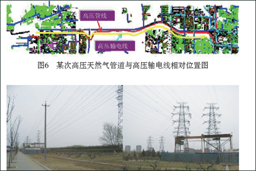 笔者带领研究团队和北京燃气集团高压公司合作,对北京燃气管网交流干扰检测评价及防护技术开展了研究。北京市某次高压天然气管线与两条100kV 和220kV 的高压输电线长距离并行, 并行距离达到7km,管线与高压输电线路相对位置如图6所示, 管道沿线并行高压线照片如图7所示。