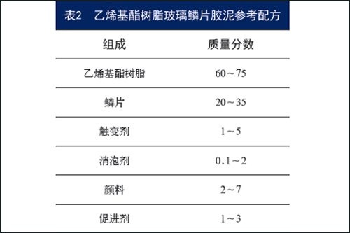 可适当添加滑石粉,钙粉,硫酸钡, 氢氧化铝,云母粉等填料。粉料的添加和耐腐蚀介质的不同而不同,还与粉料的密度有关,添加量一般都非常少,仅仅起到辅助填料的作用(主填料还是玻璃鳞片)。填料的添加会降低成本的同时,也降低了鳞片胶泥的耐腐蚀性能。并且添加的量不合适的话,会对施工性能产生影响。不同填料对VER-FC 的耐腐蚀性能的影响请参见著作《乙烯基酯树脂及其应用》中的相关介绍。