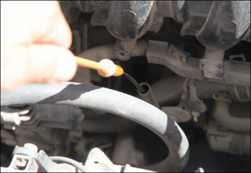 c、 汽车停放在平坦的路面上,检查前将发动机停止运转10分钟。之后将机油标尺拔出来,为了保证测量的准确,首先用棉布将标尺上的润滑油擦拭干净,然后在将机油标尺插回油底壳内。 此时再次将标尺缓慢地拔出来,检查润滑油标尺上沾附的油迹,如果油迹位于FULL(最高)和LOW(最低)标记之间,则表示机油液位在正常范围之内,不足要及时加注。