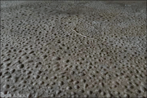 储罐底板下表面的腐蚀主要发生在边缘板区域,其发生和发展过程为:储罐底板与地基封闭密封劣化,储罐底板与地基之间形成缝隙;潮湿空气或雨雪水渗透到这些缝隙之中,这些潮湿空气或水分中, 含有氧气和盐分,在沿海地区,这些潮湿空气或水分中还有较高浓度的氯离子,于是在存在缝隙的边缘板区域下表面形成腐蚀环境,因氧浓差引起下表面的区域性腐蚀,因氯离子的作用,在氧化基础上还会形成点腐蚀(见图7)。