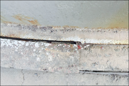 CTPU 防水涂料是目前储罐边缘板防腐较为常用的方法,它具有防水效果好,固化后与混凝土、钢材的黏结性能良好,能够形成完整的防水涂层等优点;但由于其属于多组分涂料,需要根据现场的环境温度对其各组分的比例进行调整,施工较为复杂,现场施工容易出现鼓泡、发脆、粉化开裂等问题。图5 是大港油田某储罐边缘板采用CTPU 防水涂料进行防腐处理5 年后的情况。从图中可以看出,防水涂层外观基本没有破坏,但表面有龟裂,水泥基台上的涂层有部分剥落,结合缝处有锈蚀的斑点,从斑点处拨开,发现内部已经出现锈蚀。因而, CTPU 的防腐方案还有待进一步改进。