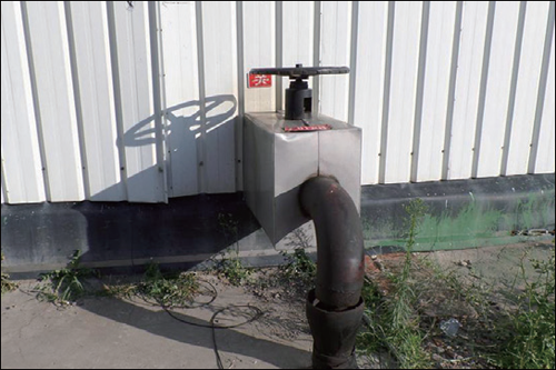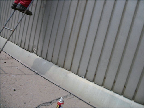 如图3 和图4 所示,用薄铁皮或橡胶带在罐壁及承台之间用角钢或压条固定,在罐壁及承台之间形成一个密闭挡雨罩,隔绝雨水进入边缘板底部。这一做法的优点是防止雨水倒灌;缺点是,橡胶带容易老化,薄钢板容易腐蚀穿孔,每隔几年就需重新更换,维护成本高;另外,这种方法虽阻隔了雨水,但密闭空间与外部存在温差,所产生的冷凝水积聚不能排出,在挡雨罩内内形成持续的潮湿环境,边缘板外侧的腐蚀依然严重。