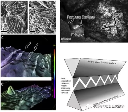 May L. Martin等[19]研究了钢中的可扩散氢与位错、空位之间的交互机制(图7),指出在实际钢质零件服役加载过程中,钢材基体中的位错、空位处于不断增值、运动过程中。进入钢中的氢元素与位错相接触,会降低位错的形核及激活能,在较低低应变速率条件下氢将随位错一并发生移动,且还可促进不同的位错发生交叉滑移,从而可促进钢材的局部塑变变形。此外,扩散氢元素会促进钢材基体中的局部微裂纹尖端钝化转变为空位,促进空位的萌生、增殖、扩展、聚集成团,且这种由氢元素产生的空位缺陷具有更高的稳定性。在实际服役加载过程中,氢促进位错的增值,位错带动氢一并发生运动聚集于晶界处发生堆积,而氢元素在晶界又将促进大量空位形成并合并成空位团簇,极大了增强的晶界处的缺陷程度,增大了应力集中有利于形成微裂纹,随着服役过程的进行,这些微裂纹就及其可能通过扩展引发零件产品出现早期失效。Afrooz Barnoush等[20]研究了在真空、氢环境条件下Fe-3wt%Si单晶体的塑性变形过程。如图8,结果表明氢进入钢材基体内部后往往沿一定取向进行富集扩散,在一定位向载荷条件下氢致微裂纹也会沿氢元素的富集方向进行扩展而无法通过局部分叉降低甚至消除应变能,从而更加易于引发材料的断裂。Jamey A. Fenske等[21]研究了钢材氢致断裂条件下的断口形貌。如图9所示,可以看出对于钢材而言,其氢致延迟断裂断口形貌显示出显著的解离脆性断裂特征。如图10,当可扩散氢浓度较高时,其往往还可沿多个晶体取向方向发生富集,从而可开动多个位错系,使断口形貌体现出明显的呈山脉起伏状的撕裂脊特征。Akihide Nagao等[22]利用带预制缺口的弯曲试样,研究了钢材在非氢及氢环境条件下的弯曲力学性能及试样断口形貌变化。如图11所示,结果表明:经过渗氢处理的试样断口形貌也随着氢浓度的增加逐渐由韧性形貌过渡到准解离、解离形貌。T.Doshida等[23]研究者进一步研究了疲劳试样在不同氢环境条件下的疲劳性能变化(图12),结果表明经冲氢处理后的疲劳试样断口呈现出明显的沿晶断裂特征。近年来国外有研究者开始致力于建立起钢材氢脆性微观机理及宏观性能之间的关系模型,力求囊括氢浓度、扩散、温度、加载速率等不同层面的关键参数于一体,从而实现对钢材氢脆性能的准确预测。典型如Jun Song等[24]建立了评价钢材是否发生氢致延迟脆断的关键参数预测模型,实现了对某钢种氢致延迟断裂的预测(图13)。Jun Song等[24]还进一步在该模型基础上,提出了可表征不同结构金属材料中氢致延迟断裂裂纹扩展的动力学模型,并以此为依据应用蒙特卡洛模拟法模拟了钢的延迟断裂过程(图14)。
