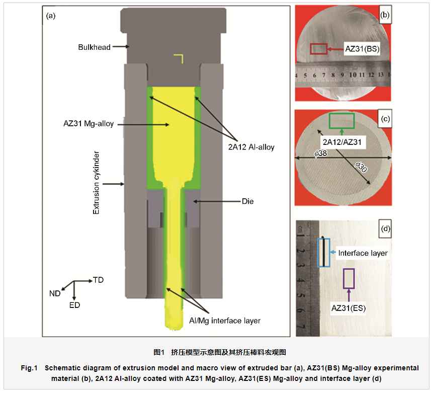 图1a为挤压棒材原理宏观示意图;铸态AZ31(BS) 镁合金在偏离中心处取样,如图1b所示;包覆样品2A12/AZ31取样如图1c所示;中间界面层及其挤压后取样 (AZ31(ES) 镁合金) 如图1d所示。