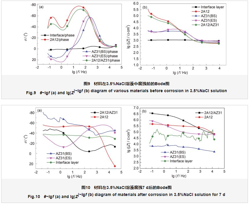 图7和8是材料在3.5%NaCl介质溶液中腐蚀前后的Nyquist图可以看出,在刚开始腐蚀的时候,2A12铝合金和2A12/AZ31包覆合金棒材的Nyquist图表现为一个容抗弧,随着腐蚀的开始,表现出半无限扩散状态,呈现出典型的Warburg阻抗直线,而中间界面层、AZ31(BS) 和AZ31(ES) 镁合金呈现阻挡扩散层,在经过7 d的腐蚀后,2A12/AZ31包覆合金棒材和2A12铝合金呈现出半无限扩散状态,中间界面层呈现出有限层扩散,而AZ31(ES) 和AZ31(BS) 镁合金继续呈现出阻挡扩散层,出现这些现象的原因可能是,呈现半无限扩散状态是由于扩散通道完全被打通;呈现有限层扩散,可能是由于Cl-不断溶解表面氧化膜,不断打通氧化膜的扩散通道,从而引起有限层的扩散;当呈现阻挡层扩散时,是因为腐蚀产物大量堆积[20],填满通道阻碍粒子传输[21],表现出晶间腐蚀状态特征。
