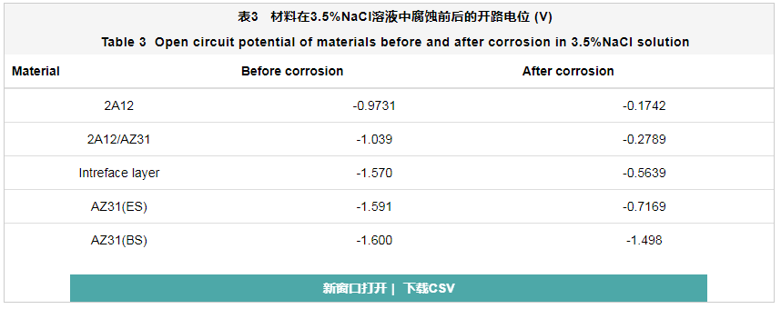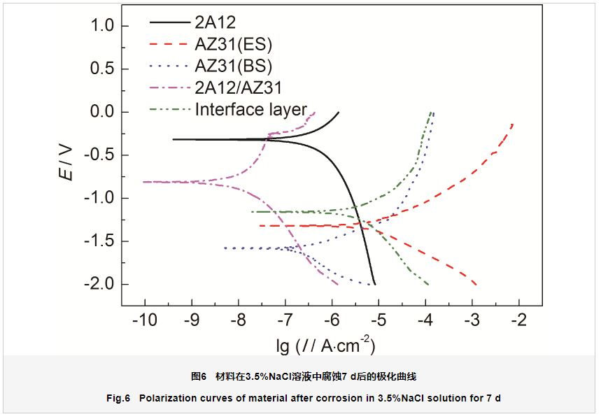 如表3所示,除了AZ31(BS) 镁合金材料外,其余材料在腐蚀后的开路电位比没有腐蚀 (初始状态) 要正得多,在未腐蚀前,铝合金包覆镁合金与铝合金的开路电位相差不大,说明包覆对保护镁合金有很好的防护作用。而界面层的开路电位与挤压态的镁合金相比,差距不大,可能是由于复合过程中界面层富集中间相,而挤压态的镁合金由于产生晶粒细化,造成晶间处富集铝镁中间相,具有比较好的耐腐蚀性能,而原始状态的镁合金其开路电位处于最负状态,说明其表面的氧化膜的保护性能非常差。在腐蚀7 d后,整体开路电位正移,其热力学状态与原始状态相比稳定性都有所提升。但是原始状态AZ31镁合金的开路电位正移不明显,这是由于镁合金是一种活泼的金属,在空气中易形成保护性氧化膜,但是此时的氧化膜在晶间或者孔隙处并不是完整、均匀的,具有较高的吉布斯自由能,造成热力学行为稳定性较差;而挤压态和界面层的热力学稳定性有很大的提升是由于腐蚀产物大量堆积在晶间或者晶体缺陷处,抑制了材料的腐蚀进度,从而提高热力学稳定性,这与文献[18]结论一致。2A12铝合金及2A12/AZ31是由于铝合金表面致密的氧化膜阻碍了腐蚀进程。