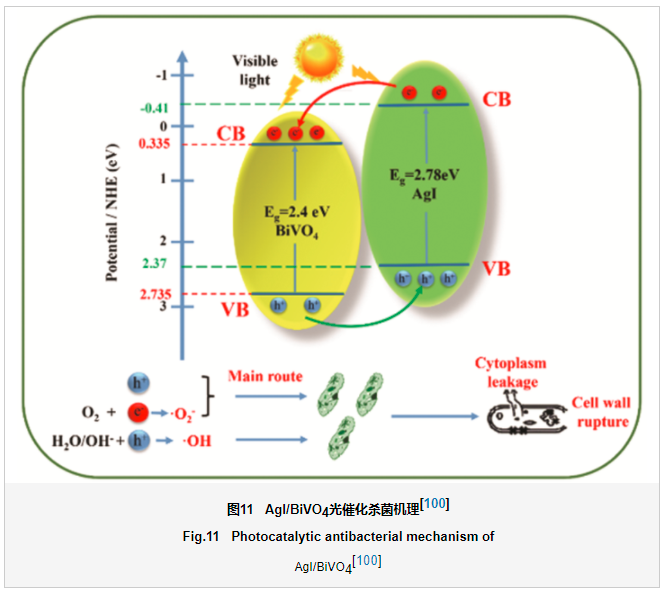 为提高BiVO4单体材料的光催化防污活性,依据能带匹配原则,设计构筑了BiOI/BiVO4[97],AgI/BiVO4[100],β-AgVO3/BiVO4[101]和V2O5/BiVO4[102]等具有异质结结构的复合材料。在可见光光照下BiOI/BiVO4复合材料表现出了良好的催化活性,光照时间120 min后的催化杀菌率能够达到99.99%[97]。光催化反应后P.aeruginosa的细胞形态和结构均发生了明显的变化,细胞壁破坏,细胞质流出,细胞死亡,·OH和h+是起主要作用的活性自由基。BiOI/BiVO4异质结光催化机理为在可见光照射下BiOI和BiVO4可以同时被激发,两种半导体价带上的电子被激发跃迁到高能级的导带上,在价带上形成了相同数量的空穴。由于BiOI导带电势比BiVO4更负,因此光生电子将继续迁移到BiVO4导带上,并在BiVO4表面捕获O2生成·O2-和·OH等自由基,而BiVO4价带上产生的空穴h+向相对电势更负的BiOI价带上转移,进而实现光生电子-空穴的有效分离,显示出了较好的光催化性能 (图10)。AgI/BiVO4复合材料在可见光照30 min后杀菌率能够达到99.99%,·O2-和h+是起主要作用的活性自由基 (图11)[100]。β-AgVO3/BiVO4复合材料光照30 min对P.aeruginosa杀菌率能够达到99.99%,远高于单体β-AgVO3和BiVO4,与AgI/BiVO4复合材料相同,·O2-和h+是起主要作用的自由基基团[101]。V2O5和BiVO4形成的异质结也能够明显提高复合材料的可见光吸收性能[102]。V2O5/BiVO4纳米复合材料在无光照条件下也具有良好的接触杀菌能力,2 h后接近100%;而加可见光照后,杀菌能力得到进一步的提升,在30 min后就达到95%以上,继续延长作用时间,杀菌率继续增大,在2 h时达到99.99%。说明可见光照可大幅提升复合材料的杀菌能力,同时V2O5的纳米催化效应赋予复合材料在暗态下也具有良好的杀菌性能,可弥补可见光催化材料在无光照条件下无法发挥效用的技术瓶颈,将拓展可见光催化材料在防污领域的应用范围。