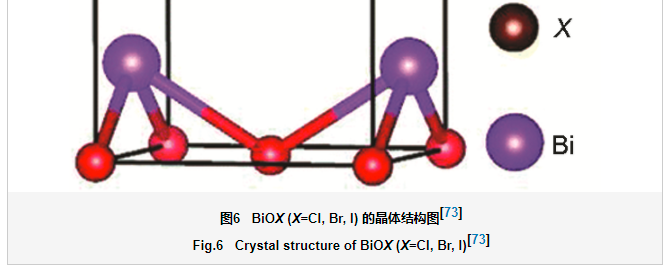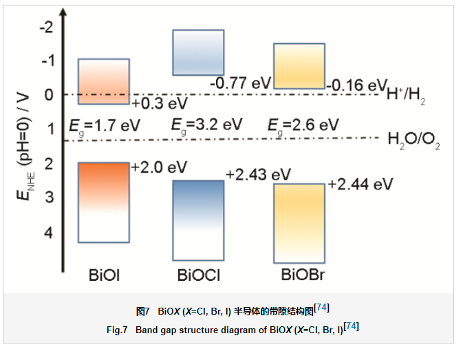 卤氧化铋 (BiOX,X=Cl、Br、I) 是一类重要的V-VI-VII型三元半导体化合物,由于其良好的光化学活性在近几年备受关注[71,72]。BiOX呈现四方晶体结构,双层卤原子镶嵌于[Bi2O2]2+层中,其晶体结构如图6所示[73]。研究[71,72,73]表明其开放的晶体结构及间接带隙性质使得其具有良好的光化学活性。间接带隙性质意味着被光子激发的自由电子需要以一个特定的k空间矢量才能回到价带,使得光生载流子的复合率降低,增加了其光化学活性。此外,其开放的晶体结构使得[Bi2O2]2+层与卤素层之间易建立较强的内电场,加快了光生载流子的分离效率,进一步提高卤氧化铋的光催化活性。BiOX半导体材料体系中,禁带能级按Cl,Br,I的顺序逐渐降低,其具体禁带宽度分布见图7[74]。其中,BiOBr带隙约为2.7 eV,BiOI带隙约为1.7 eV。因此,与BiOCl (Eg=3.2 eV) 相比,含有BiOBr或BiOI的体系通常都展现出良好的可见光吸收活性,成为更有潜力的可见光催化材料。