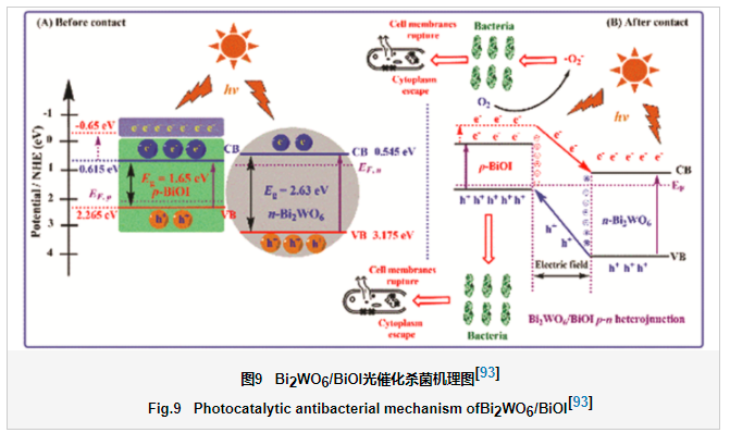 进一步以Bi2WO6、BiVO4和BiOI为基础材料,利用多种无机纳米材料复合制备技术可控合成了系列纳米复合材料[93,98,99]。如通过半导体复合的方法,利用一步水热法制备了Bi2WO6/BiVO4复合材料,通过控制反应时间以及Bi2WO6和BiVO4的复合比例实现了对Bi2WO6/BiVO4的控制合成[98,99]。Bi2WO6/BiVO4是一种三维巢状多层微球结构,由很多Bi2WO6和BiVO4纳米薄片在PVP作用下经过各向异性生长和奥氏熟化过程层层组装而成。Bi2WO6/BiVO4在30 min内对P. aeruginosa的杀菌率可达到99.99%,而且稳定性良好。同时,对E. coli和S. aureus也显示出极佳的光催化杀菌性能,30 min内杀菌率均可达到99.99%,具有广谱抗菌性能和良好环境稳定性。Bi2WO6/BiVO4异质结结构的形成提高单体材料光催化反应活性,·OH和h+是起主要作用的自由基,对细菌具有很强的杀灭能力 (图8)。除BiVO4外,BiOI也可与Bi2WO6复合形成异质结结构,进而具有更好的光催化活性[93]。Bi2WO6/BiOI在60 min内对P.aeruginosa光催化杀菌率可达到99.99%,比Bi2WO6和BiOI两种单体材料具有更好的光催化性能,这是由于Bi2WO6与BiOI复合之后形成了p-n异质结,加速了光生电子-空穴的分离,极大地提高了两种单体材料的光催化活性 (图9)。