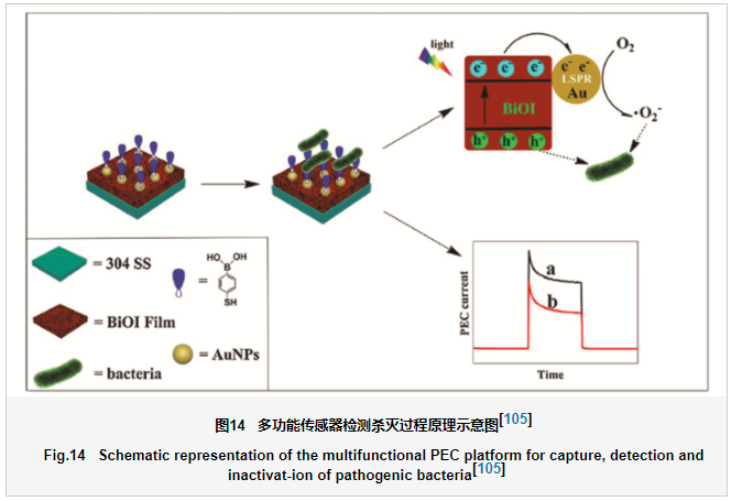 以上研究开发了多种具有增强光催化防污活性的复合材料,相较于3种单体材料均有较大的提高和改善,同时基于复合材料体系进一步分析获取了复合材料的光催化杀菌机理,提高了复合材料在无光照条件下的杀菌率。这些新型高性能材料在海洋防污领域将具有广阔的应用前景。但粉体材料无法在海洋环境中应用,因此,为解决这个阻碍铋基光催化材料在海洋实际环境中应用的问题,采用晶体原位生长的方法首次实现了BiOI纳米分级结构薄膜材料在柔性基底304SS网表面的原位生长[103]。BiOI薄膜与304SS钢丝紧密结合,膜层厚度约为2 ?m,宏观呈亮黄色 (图12)。所制备BiOI薄膜材料对E.coli和S.aureus在光照120 min后的杀菌性能均超过了99.9%。采用实验室模拟挂片的方法进一步探究了在304SS片表面所制备BiOI薄膜材料对微藻Chlorella vulgaris在日常光照 (昼夜交替) 条件下的光催化防附着性能。当挂片时间较短时 (2周以内) 薄膜在全光谱照射下具有良好的防藻类附着行为,Chlorella vulgaris难以在基片表面附着生长,防污性能良好。304SS基体表面原位生长BiOI薄膜材料在水溶液中的光催化反应机理为BiOI薄膜材料在可见光照射下,位于价带上的e-跃迁至导带,并在价带上产生等量的h+。由于O2/·O2-的氧化还原电位比BiOI导带上的e-高,致使O2被BiOI导带上的e-还原为·O2-。由于·O2-和材料价带上的h+具有很强的氧化能力,可以作用于生物细胞,杀灭或抑制细菌及藻类繁殖。为进一步解决单体BiOI薄膜光生载流子分离速度慢和光催化能力低的缺点,首次采用四丁基溴化铵为缓释溴源,在水热条件下与BiOI单体薄膜材料发生离子交换可控制备出BiOI/BiOBr异质结结构光催化薄膜材料[104]。研究表明该半导体薄膜在可见光照射下可以将细菌质粒DNA分解 (图13)。同时由于质粒的环状DNA具有核酸等遗传物质一般结构,这也侧面说明了所制备材料对细胞核内的遗传物质也能发挥光催化降解作用。这一实验结果进一步丰富了光催化半导体材料的光催化杀菌机理。此外,结合原位还原沉积技术,本课题组在304SS表面原位生长了具有光电及光催化活性的巯基苯硼酸修饰的AuNPs/BiOI/304SS多功能光电平台,对革兰阴氏细菌表现出很好的特异性,同时纳米金不仅作为链接单元,同时能够在光催化杀菌中增强光催化性能 (图14)[105]。所制备的多功能光电平台对E.coli表现较高的检测灵敏度灵敏,检测限低至42 cfu/mL,同时表现出良好的可见光催化杀菌性能,光照20 min情况下对污损模式细菌的杀灭率高达99.99%,进一步拓展了光催化技术在海洋防污领域的应用范围。