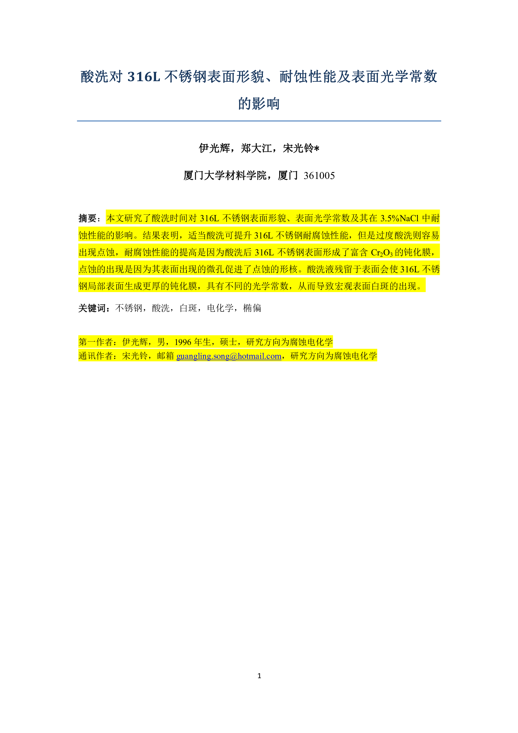 酸洗对 316L 不锈钢表面形貌、耐蚀性能及表面光学常数的影响