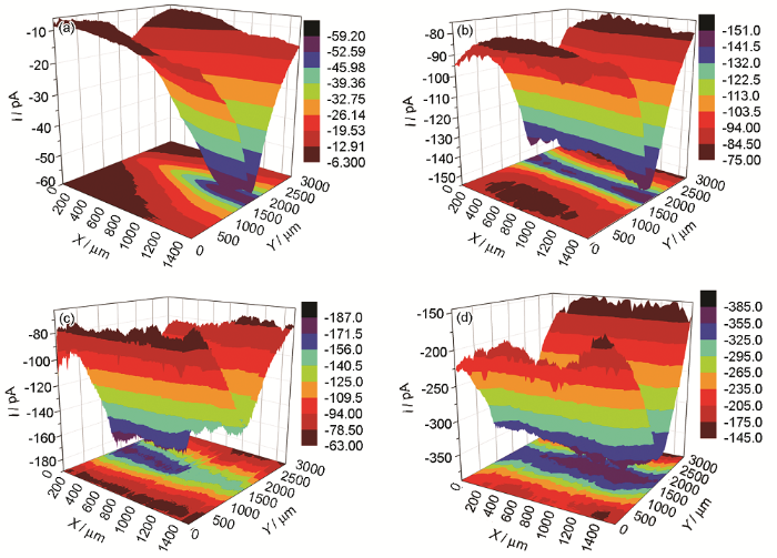 图6给出了涂层缺陷试样在不同交流电流强度下浸泡不同时间SECM探针电流。可以看出:(1)在未施加交流电流时(0 h)涂层缺陷处的探针电流的数量级为10-11,随着浸泡时间的延长涂层缺陷处的探针电流不断增大,说明腐蚀电化学活性不断增大,局部腐蚀程度逐渐增大;(2)通电浸泡5 h探针电流稍有增大;浸泡10 h探针电流明显增大,比未施加交流电流时增大了近1个数量级,达到10-10数量级;浸泡24 h探针电流更明显增大;(3)在通电浸泡时间相同的条件下,交流电流强度越大则涂层缺陷处探针电流越大,腐蚀速率越大。施加的交流电流强度增大时涂层缺陷处发生的电化学反应加剧,电极反应的电子数n增大,探针电流i随之增大。