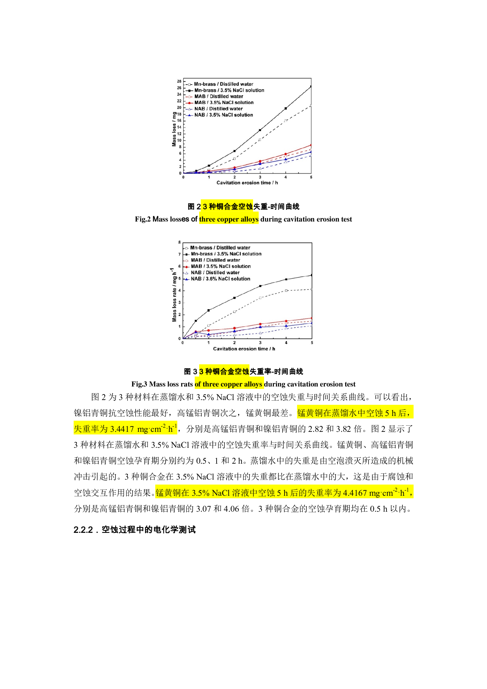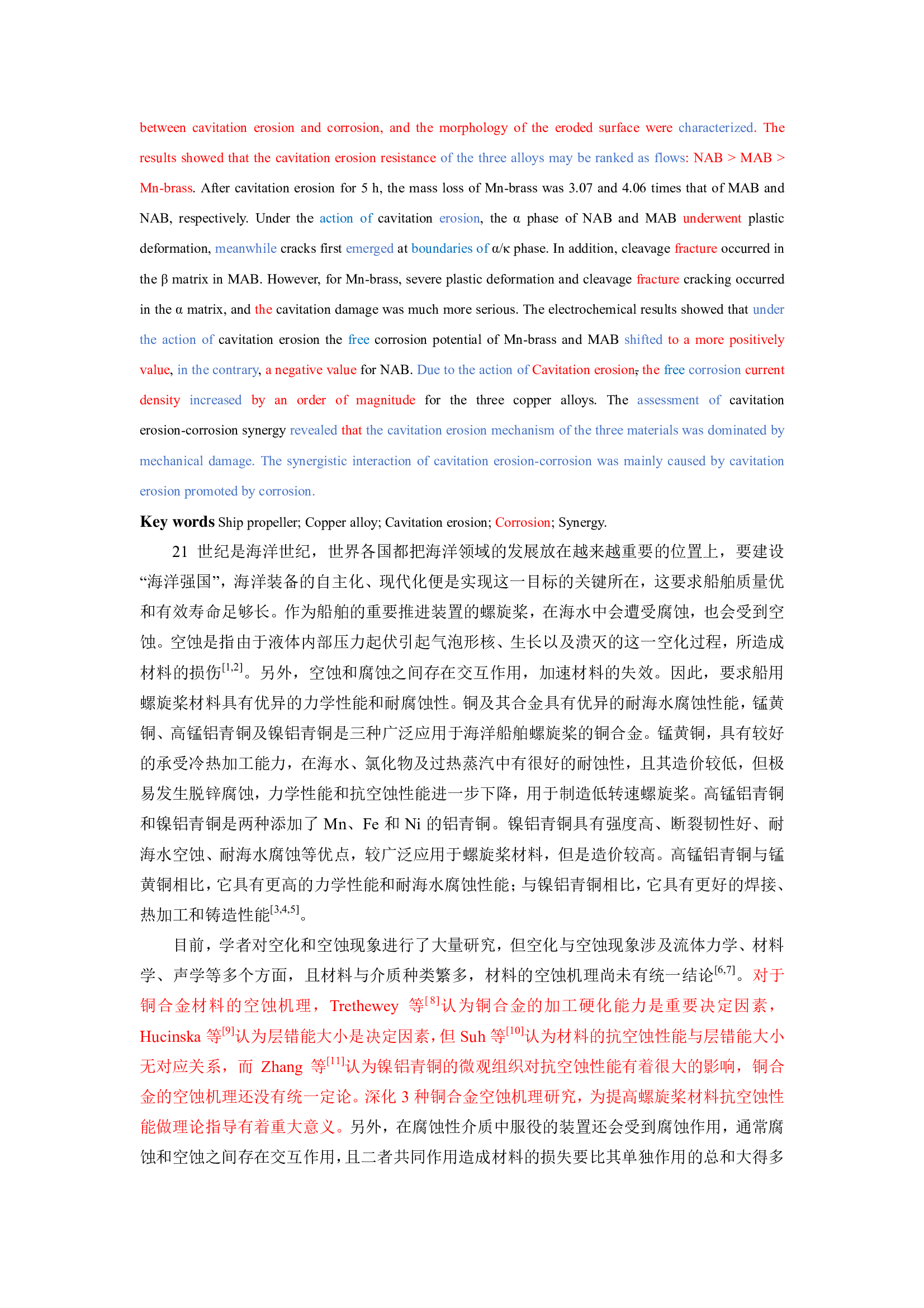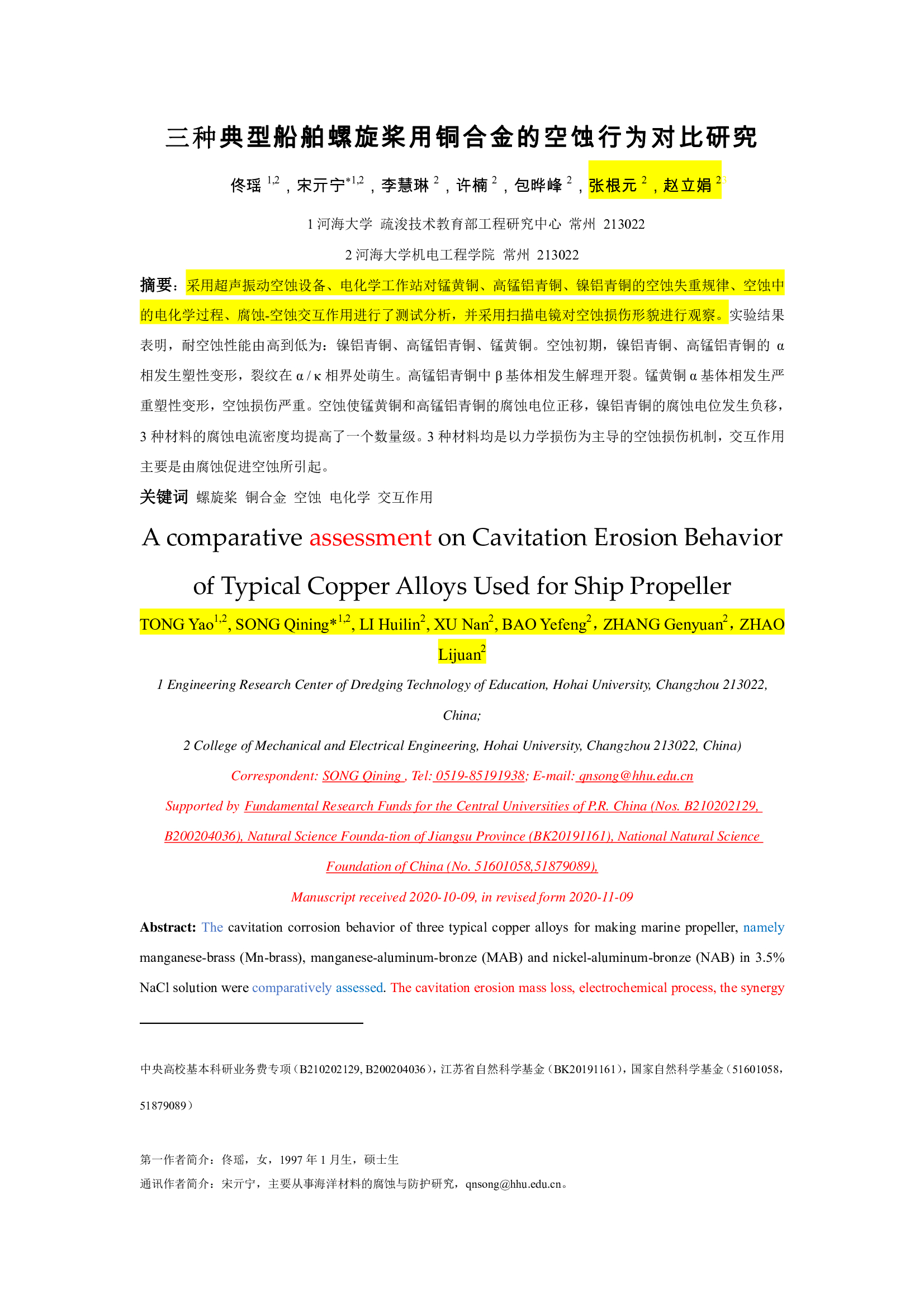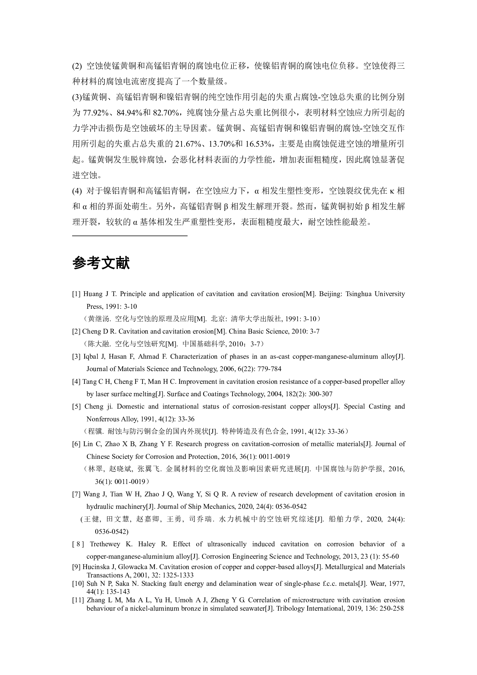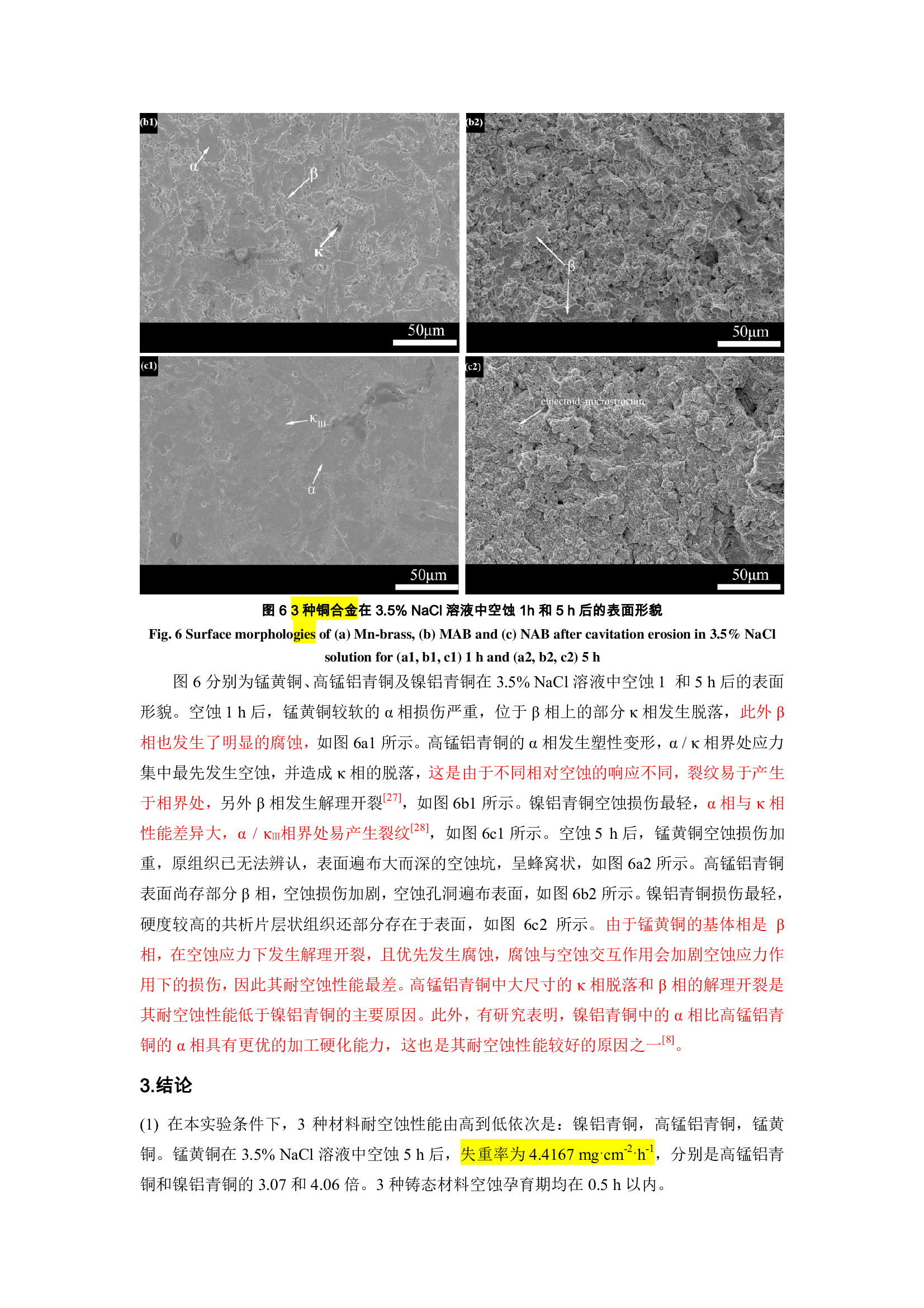 三种典型船舶螺旋桨用铜合金的空蚀行为对比研究