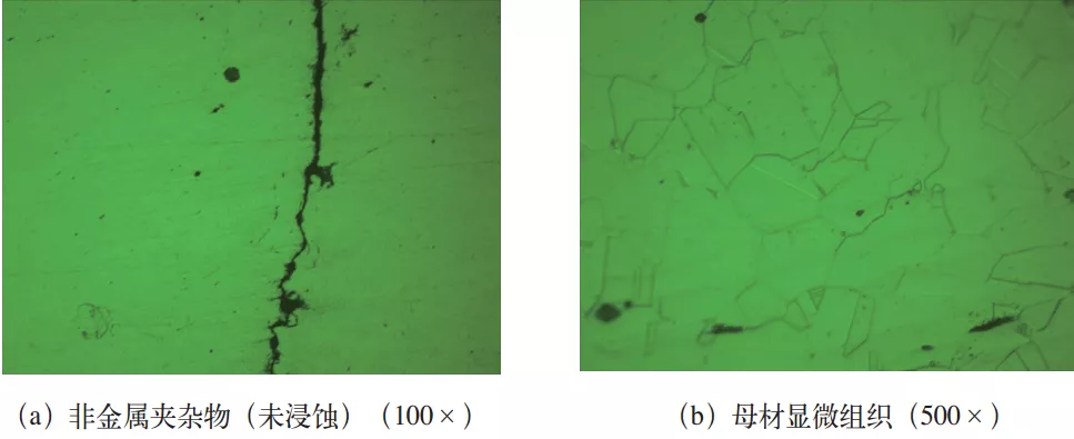 从渗液处(见图1c)截取试样,试样包括母材、焊缝和热影响区,对试样进行预磨、粗磨、精磨和抛光,使用OLYMPUS-GX51金相显微镜对试样进行非金属夹杂物观察,之后用三氯化铁盐酸水溶液对其浸蚀,在金相显微镜下对试样进行组织观察(见图2)。