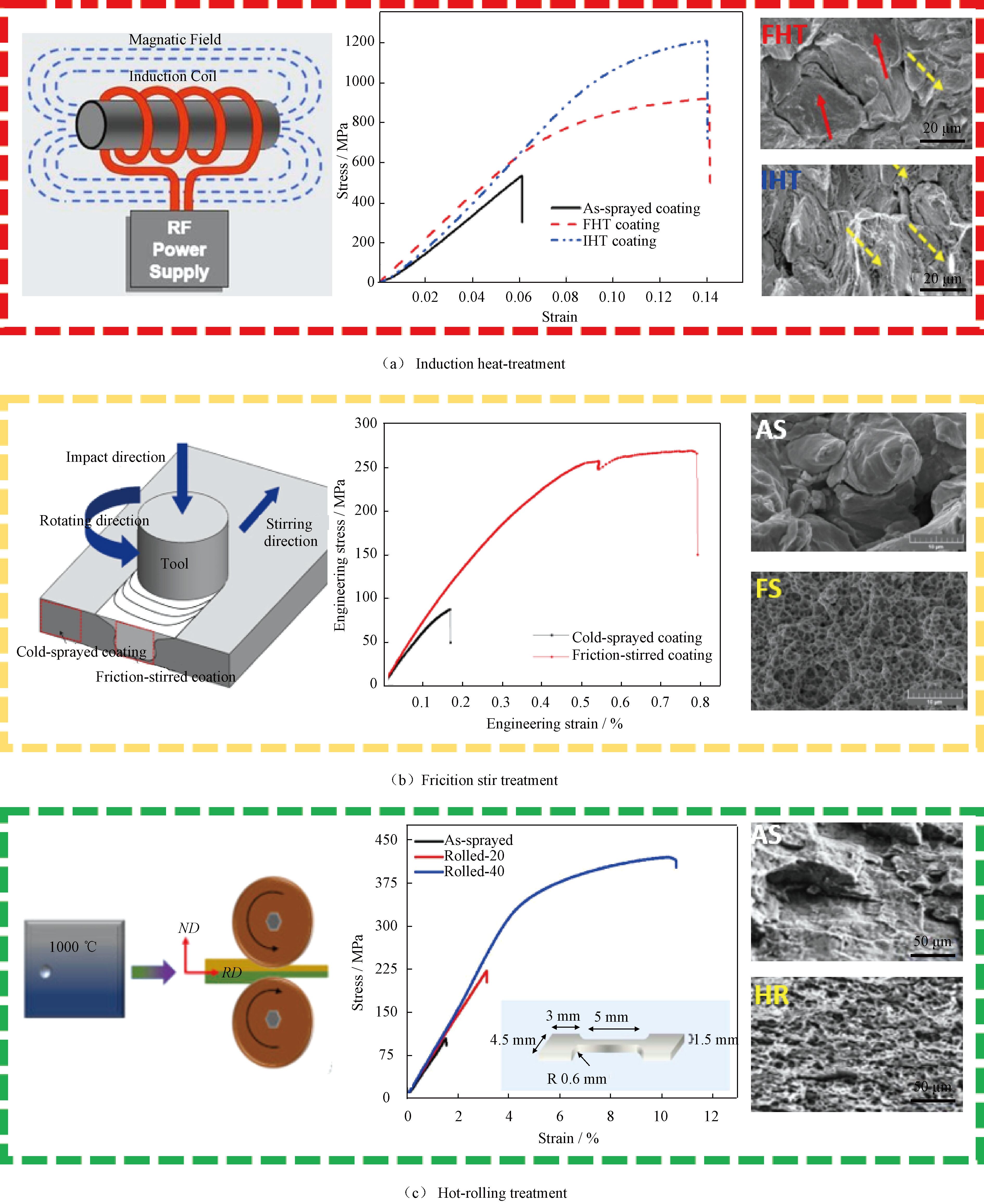 除了常规的热处理外(如图8( a)所示),近期SUN W等[63] 在采用感应热处理( Induction Heat Treatment, IHT) 对冷喷涂IN718 涂层进行后处理的试验中发现,涡流加热过程中颗粒界面结合较差处电阻更高的特性有利于局部高温的产生,从而更有利于颗粒界面的愈合,因此比常规热处理(FHT)的效率更高。另一方面,在冷喷涂金属修复领域,有望利用感应热处理中电流的集肤效应,在使表面修复层组织和性能提升的不同,不会对基材产生负面影响。