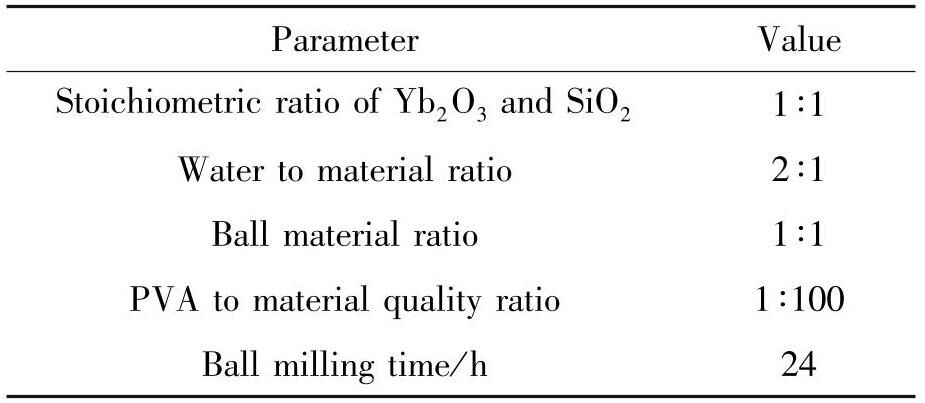 硅酸镱的化学计量式为Yb2 SiO5,Yb2O3 和SiO2 的质量分数分别为86.77%和13.23%,按照此比例配料。球磨混料时,首先将水和磨球放入球磨机中搅拌,然后依次加入各种纳米粉末,待粉末与水搅拌均匀后,向混合物中加入1%的PVA胶水,PVA加入的时间应在Yb2O3 与SiO2 粉体球磨混合均匀后,以防止形成大量单一粉体的团聚体而不利于后续的固相反应。粉末,磨球、水、PVA的添加比例如表1所示,球磨24h之后,将得到的浆料用于喷雾干燥。
