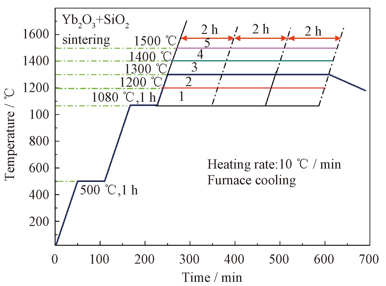 根据纳米Yb2O3 +SiO2(含1%PVA) 粉体的TG-DSC曲线制定了烧结工艺曲线,如图7所示。设定了分别用1080、1200、1300、1400和1500℃ 作为烧结温度,同时设置了保温时间为2、4和6h作为对比,以研究烧结温度和保温时间对纳米Yb2O3 +SiO2 固相反应产物的影响。固相反应中升温速率均为10℃/min, 冷却方式为随炉冷却。