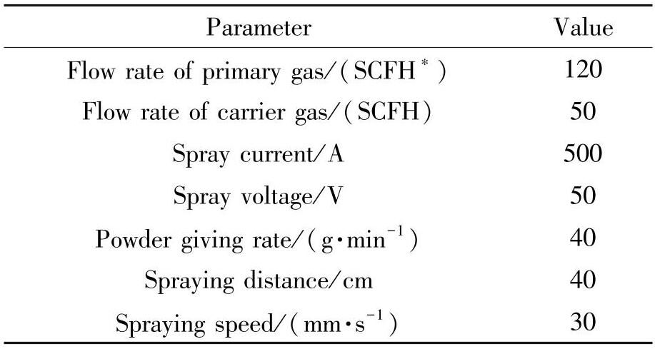 为了提升粉体喂料的性能,固相烧结后可以对粉体进行等离子处理。通常喷雾干燥后的粉末相对来说流动性不是很好,球形度和致密度也都较差,且球面粗糙,而经过等离子处理之后粉末的球形度和表面光滑度得到了提高,致密度和流动性也会明显提高。文中使用的设备为Metco 9M等离子喷涂系统,处理参数如表3所示。