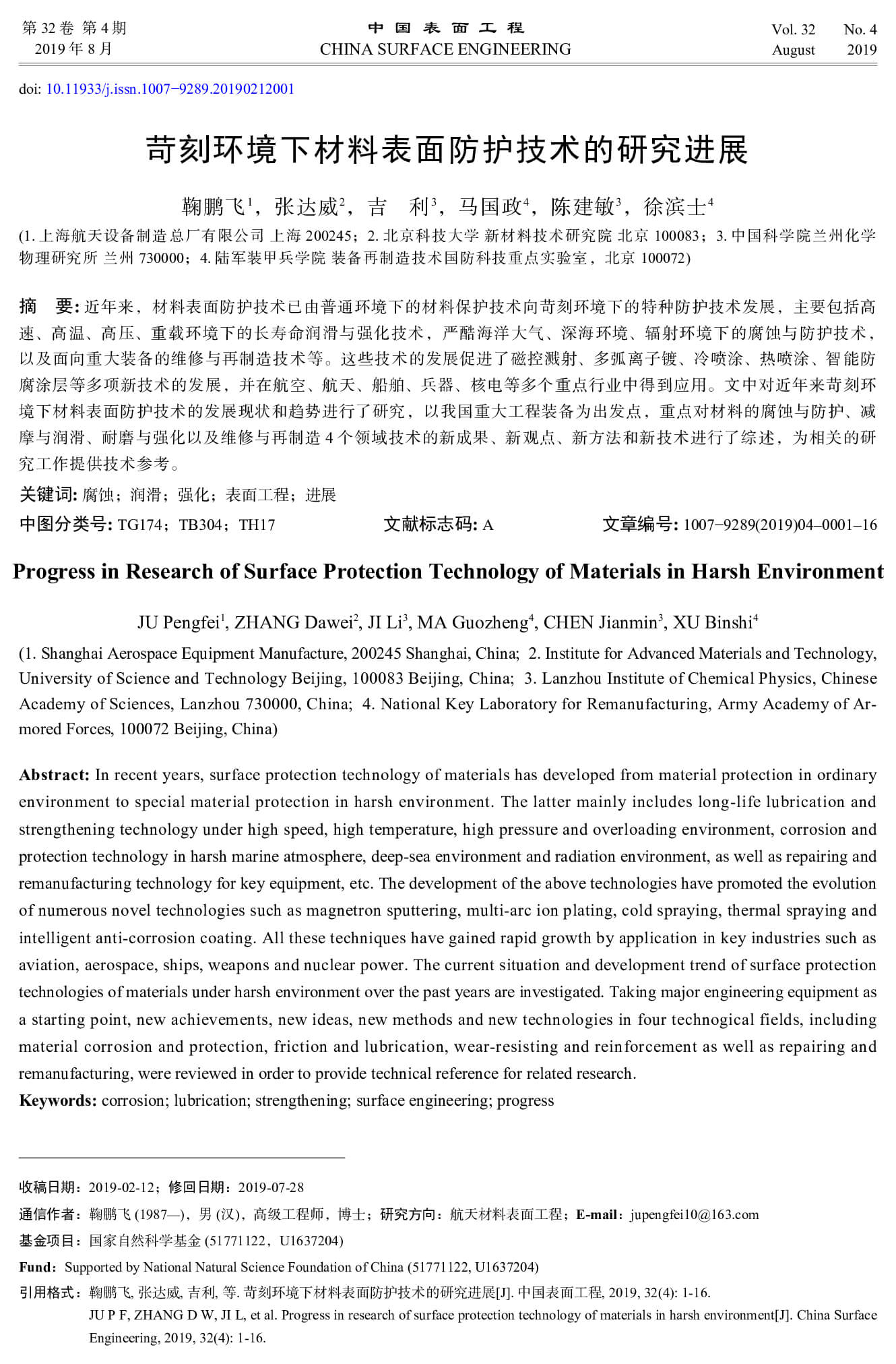 2021-06-28 15:26:33 作者:鞠鹏飞,张达威,吉利,马国政,陈建敏,徐滨士 来源:中国表面工程 分享至: