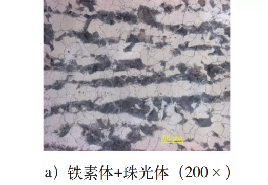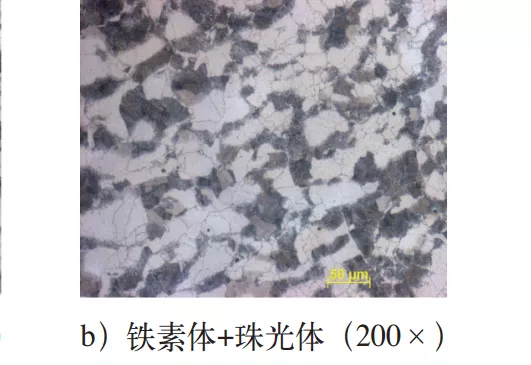 参考的显微组织如图2所示。图2a中为铁素体+珠光体,可接收;图2b中为铁素体+珠光体,可接收;图2c中为铁素体+珠光体+贝氏体,拒收。
