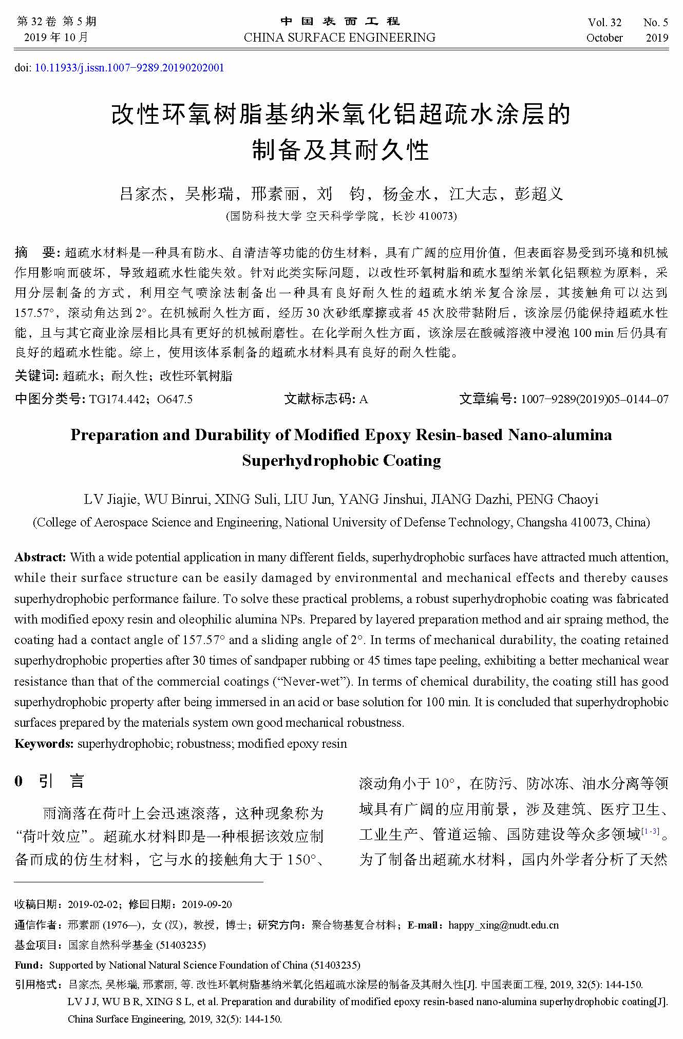 标签: 超疏水 耐久性 改性环氧树脂