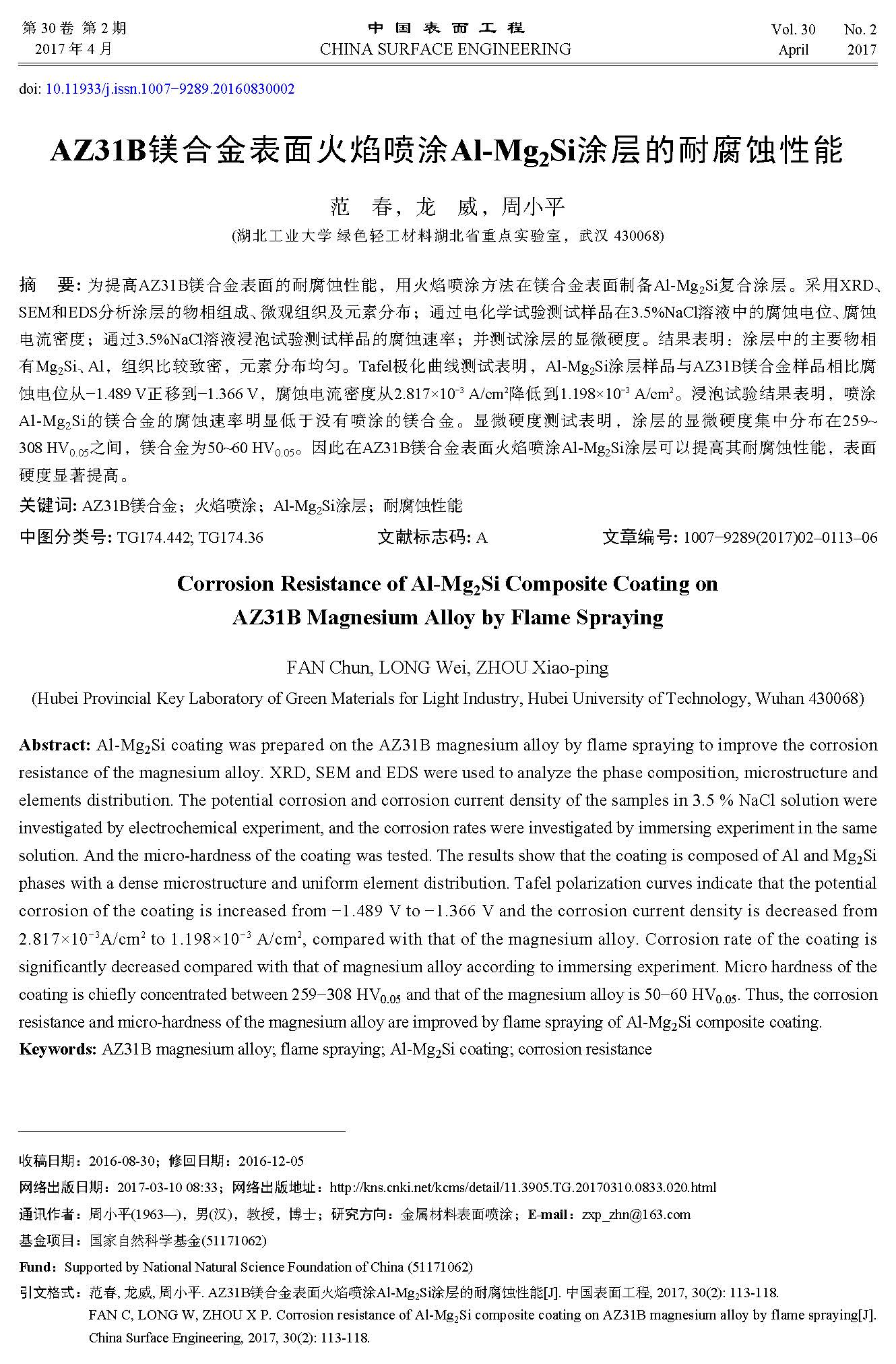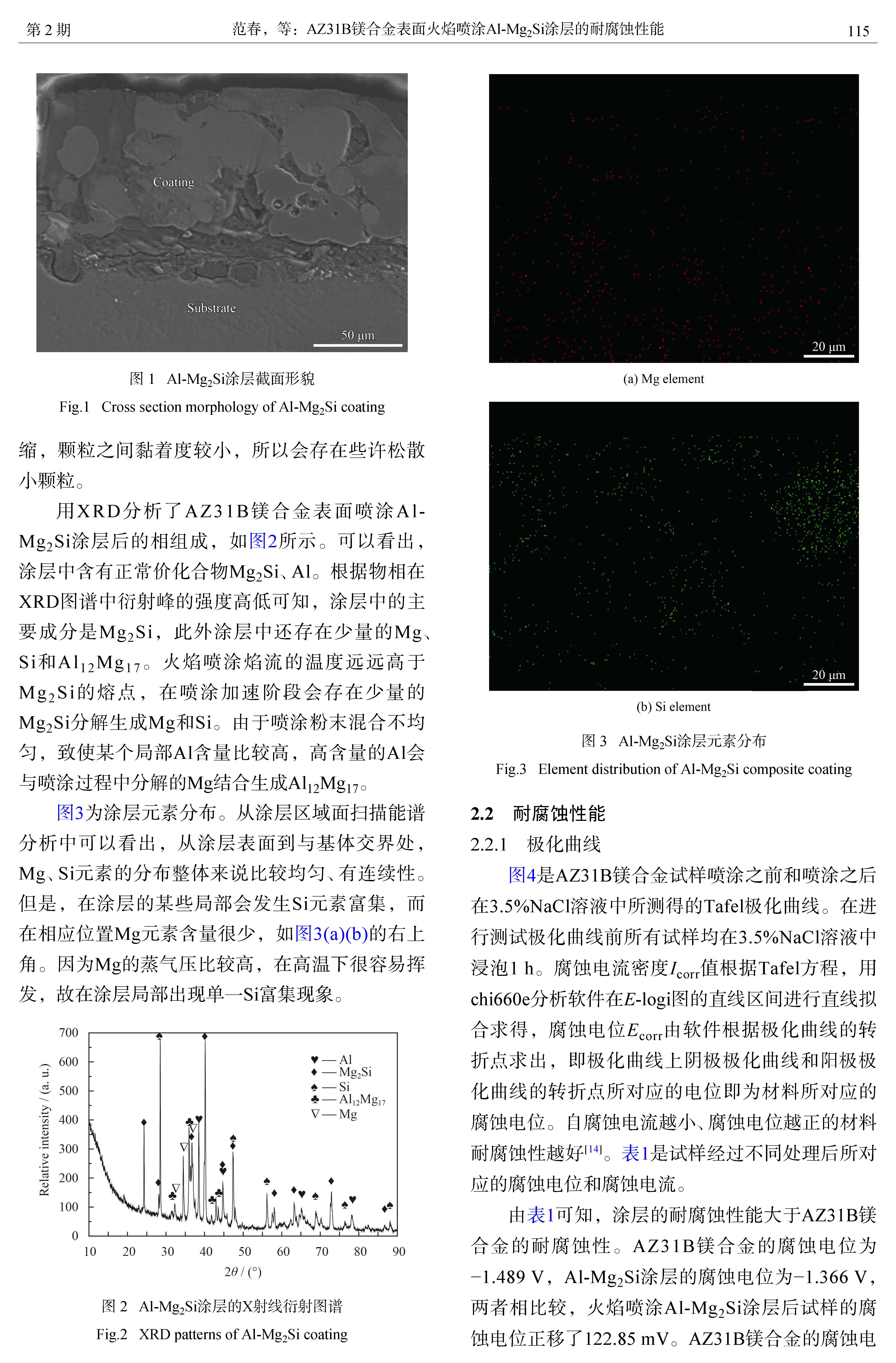 标签: AZ31B镁合金, 火焰喷涂, Al-Mg2Si涂层, 耐腐蚀性能