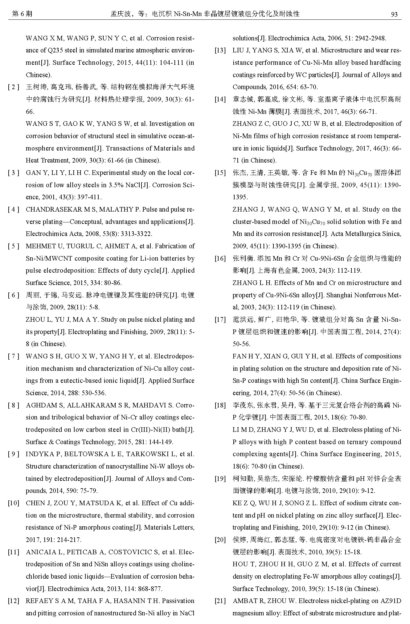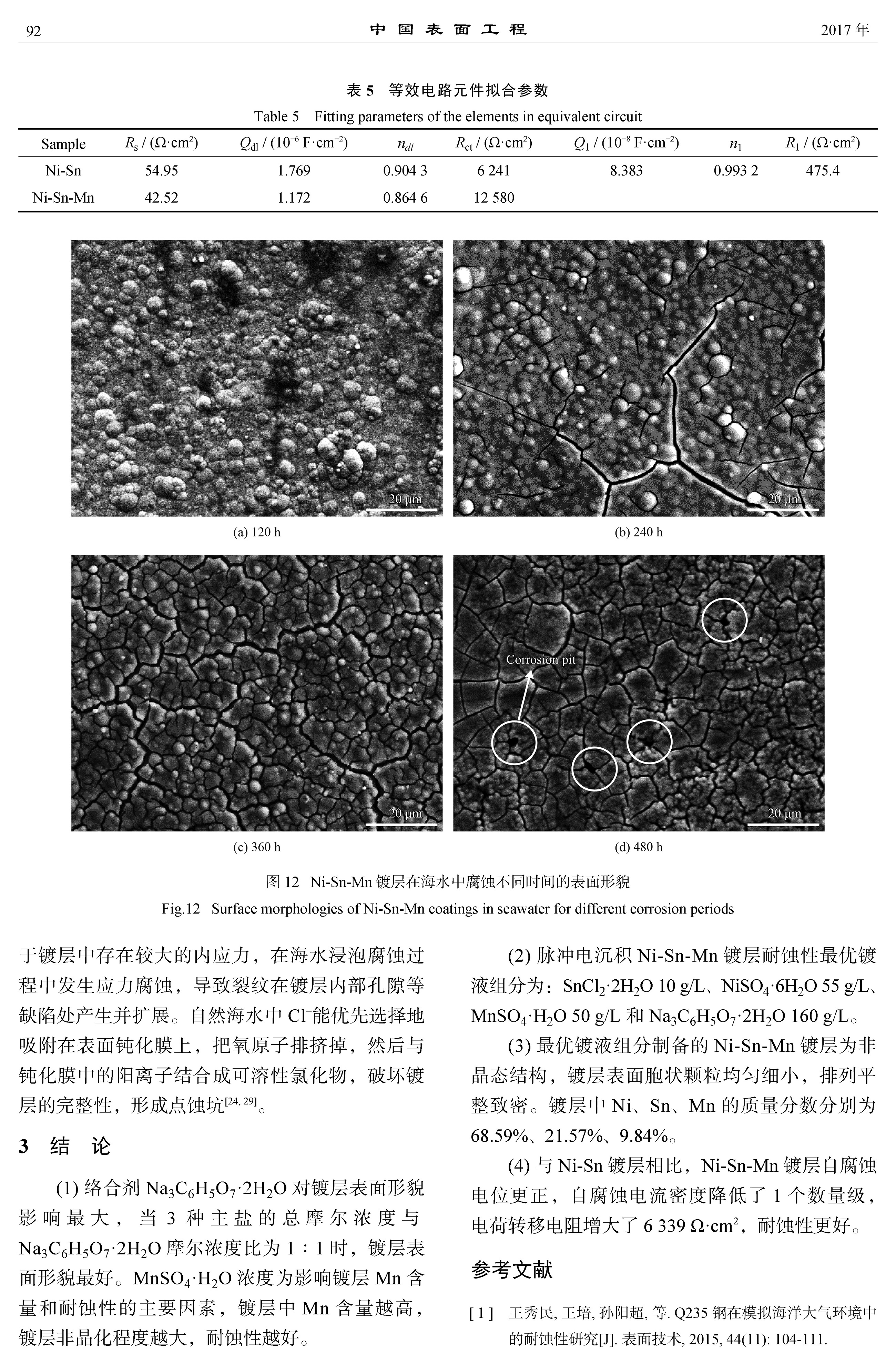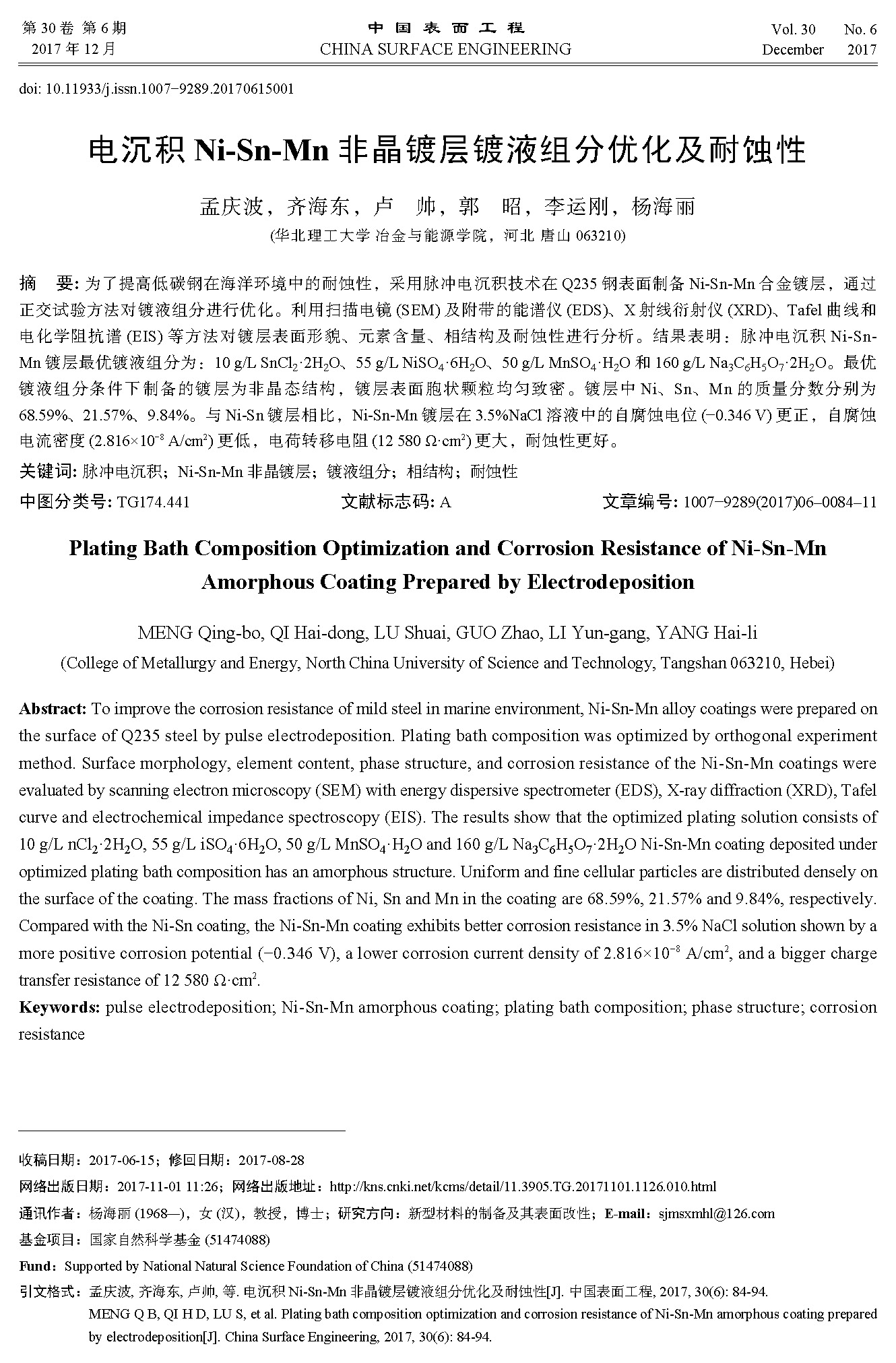 标签: 脉冲电沉积, Ni-Sn-Mn非晶镀层, 镀液组分, 相结构, 耐蚀性