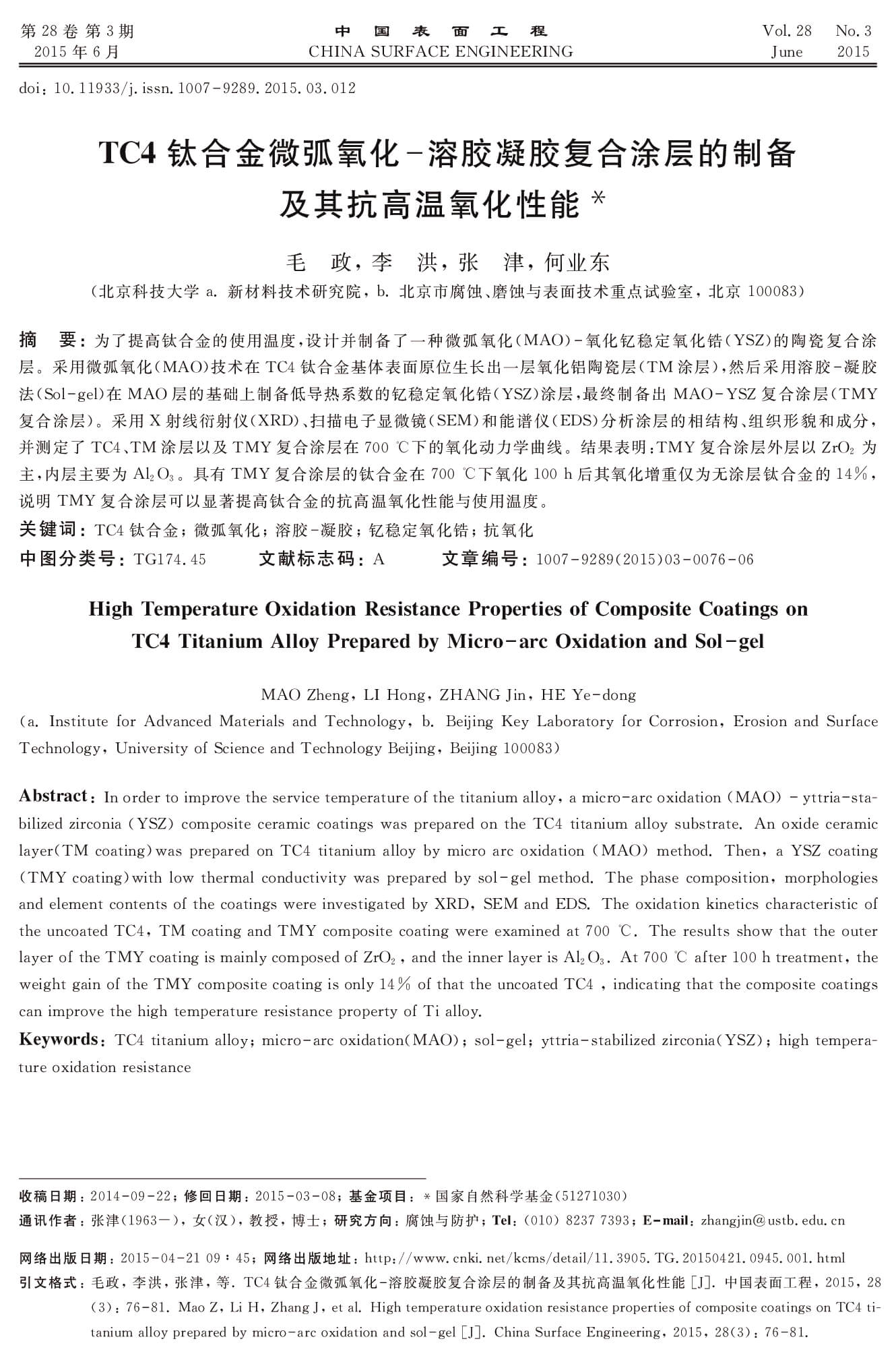 TC4钛合金微弧氧化溶胶凝胶复合涂层的制备及其抗高温氧化性能