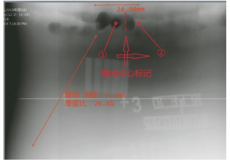 选择焊缝腐蚀坑测量点时,应主要考虑焊缝余高的变化、内外余高叠加、双壁透照时两个焊缝叠加等引起的透照厚度和散射比的变化。第1点选择在腐蚀坑灰度最大的部位,第2点选择在该点附近沿着焊缝偏移至无腐蚀的部位;在选择第2点时也应考虑射线束偏离中心带来的透照厚度的变化,随着测量点远离曝光中心点,厚度偏差变大,因此将曝光中心设在第1点和第2点的中间位置可降低该因素的影响,焊缝腐蚀坑测量点位置如图6所示。