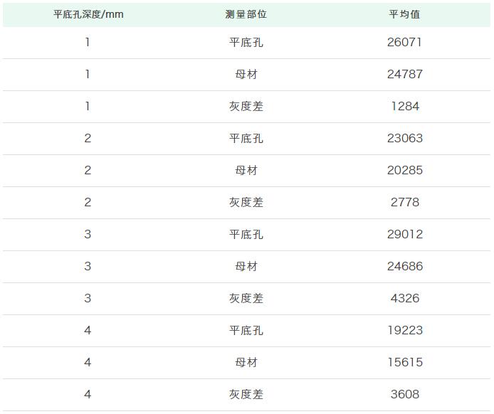 由曲线斜率k的计算公式k=ΔG/Δh(ΔG为灰度差,Δh为平底孔深度)得出平均斜率图片=1262,数据相对偏移量为-1.20%~15.82%,绝对偏移量为-0.12~0.32mm,数据统计结果如表4所示。