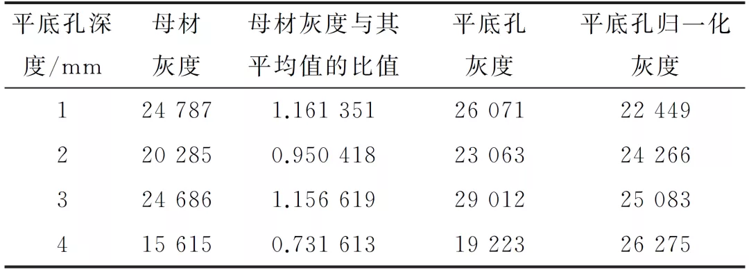 理论上相同的曝光条件下,母材的灰度应是相同的,但是在实际检测中焦距、照射方向的厚度差异会引起母材的灰度差异,亦会引起腐蚀坑的灰度差异,可以通过归一化计算法降低该偏差,归一化计算结果如表3所示。