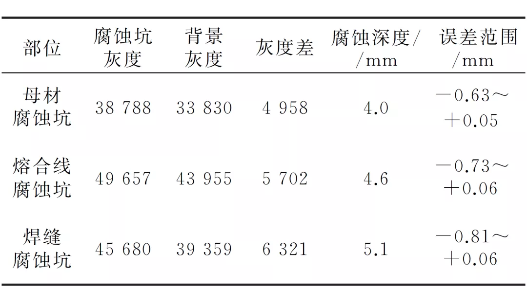 根据测量的灰度数据,按上述计算方法得出腐蚀坑深度,腐蚀坑灰度及深度数据如表5所示。