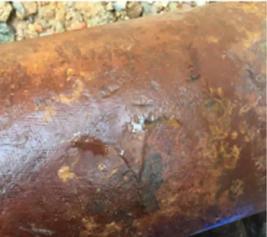 对ACVG和DCVG检查出的3处埋地管道防腐蚀层缺陷部位进行开挖验证,发现2处防腐蚀层缺陷。图3(a)所示缺陷处管道发生穿孔泄漏,图3(b)为24cm×5cm的长条状埋地消防水管道防腐层缺陷,为管道安装过程中机械损伤所造成的。探坑开挖部位防腐蚀层附着力测试结果为合格。