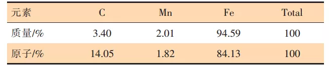 针对管件上不规律分布的腐蚀孔洞和厚度极不均匀的壁厚,对管件的腐蚀区域和未腐蚀区域的基材分别取样进行能谱分析(EDS),确定腐蚀原因是否为基体材质成分不均造成。腐蚀区域能谱分析结果如表2所示,未腐蚀区域能谱分析结果如表3所示。