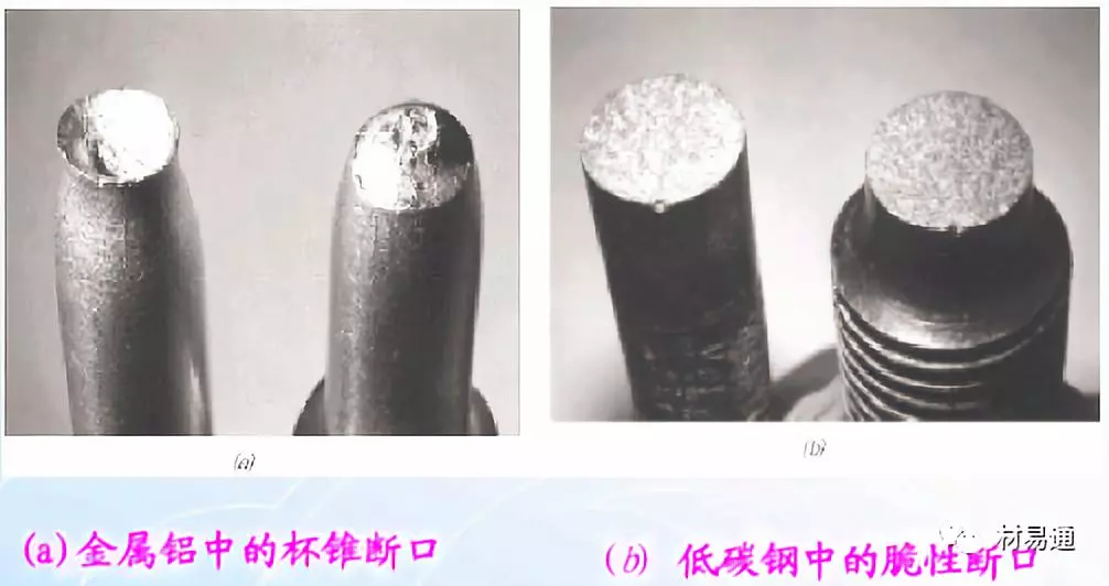 韧性材料的拉伸断口一般呈杯锥状或呈45°切断的外形,其塑性变形是以缩颈的方式表现。即断口与拉伸轴向最大正应力交角是45°。