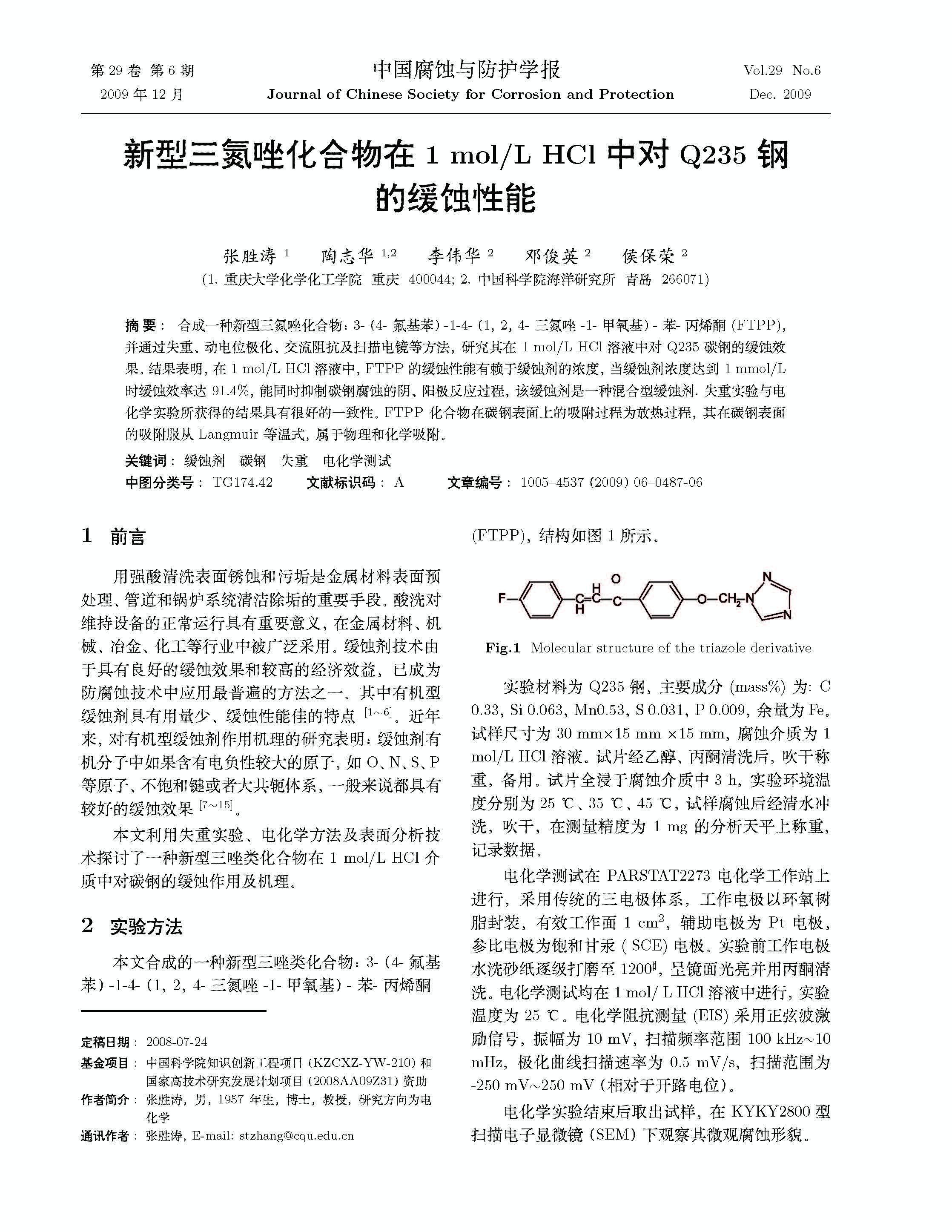 新型三氮唑化合物在1 mol/L HCl中对Q235钢的缓蚀性能