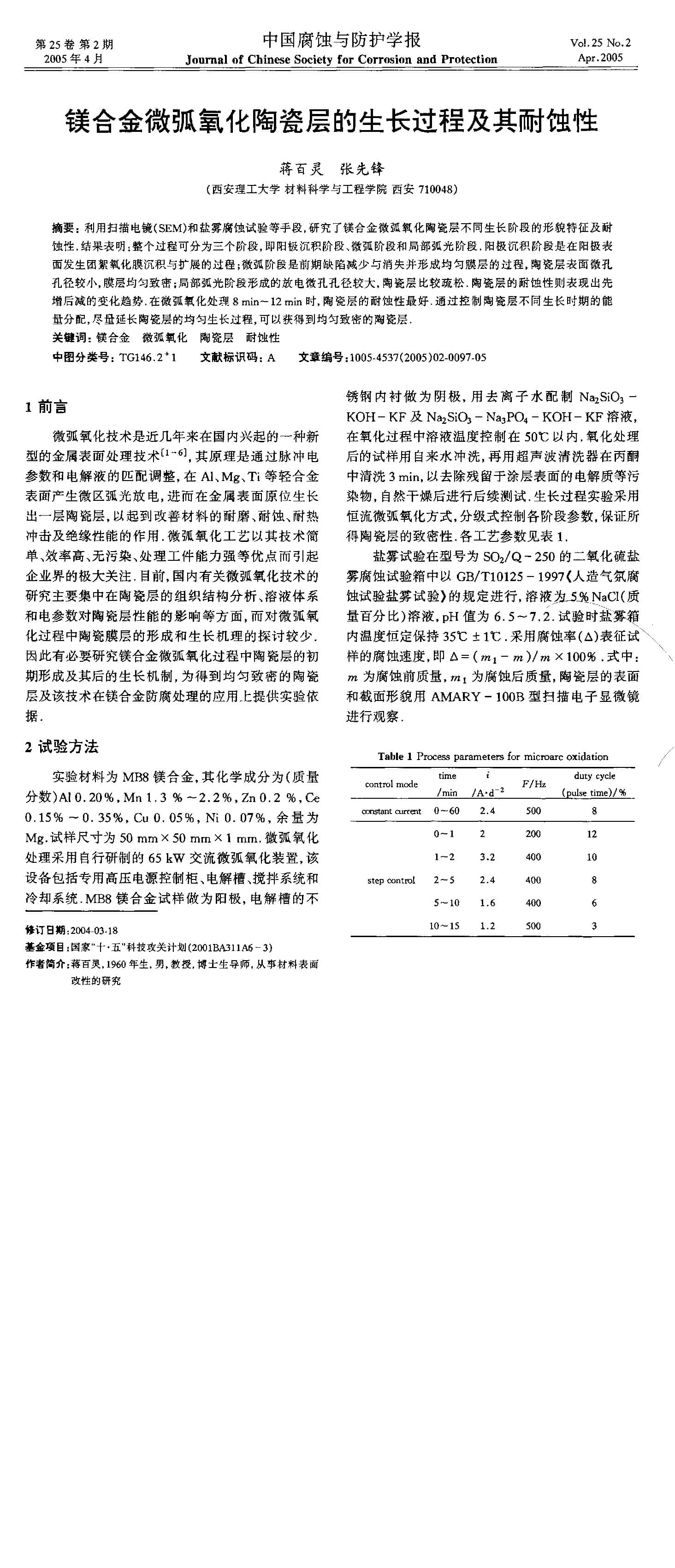镁合金微弧氧化陶瓷层的生长过程及其耐蚀性