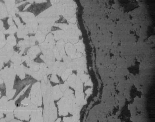座耳的机加工端面的晶间腐蚀明显,使之成为蜂窝状,沿轧制的条状δ铁素体深入母材(图3-33)。