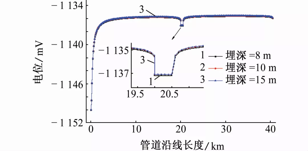 图10 穿越段管道埋深对管道电位分布影响的计算结果