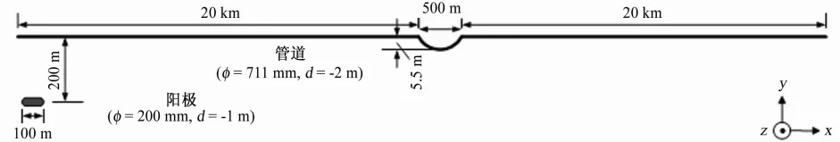 为了研究穿越段管道阴极保护电位的影响因素,采用数值模拟软件,建立定向钻穿越管道的理论模型,模型的各项参数如图5所示,通过改变试验条件,计算管道防腐蚀层质量、土壤电阻率、管道埋深等参数对阴保电位的影响。
