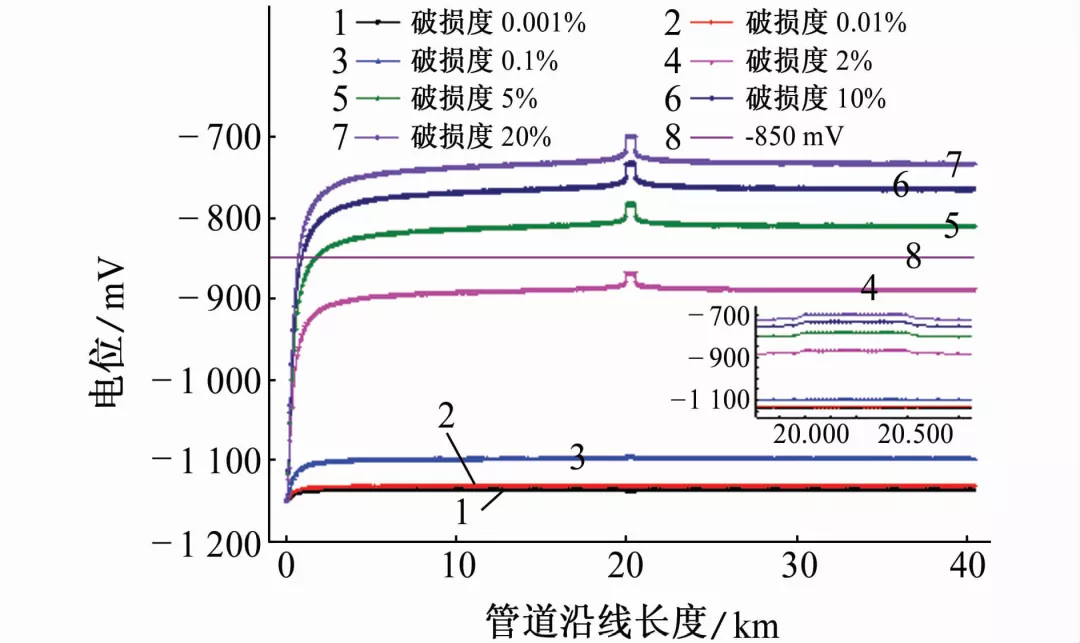 图7 穿越段管道防腐蚀层破损率对管道电位分布的影响(模拟计算结果)