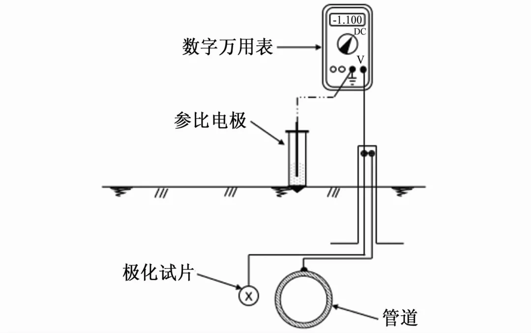 在管道周围埋设裸露面积为6.5cm2的极化试片,试片通过测试桩管道线与管道连接,极化24h后,采用铜/饱和硫酸铜参比电极(CSE)和万用表,测试极化试片连接时管道的通电电位和极化试片从管道上断开后试片的断电电位。
