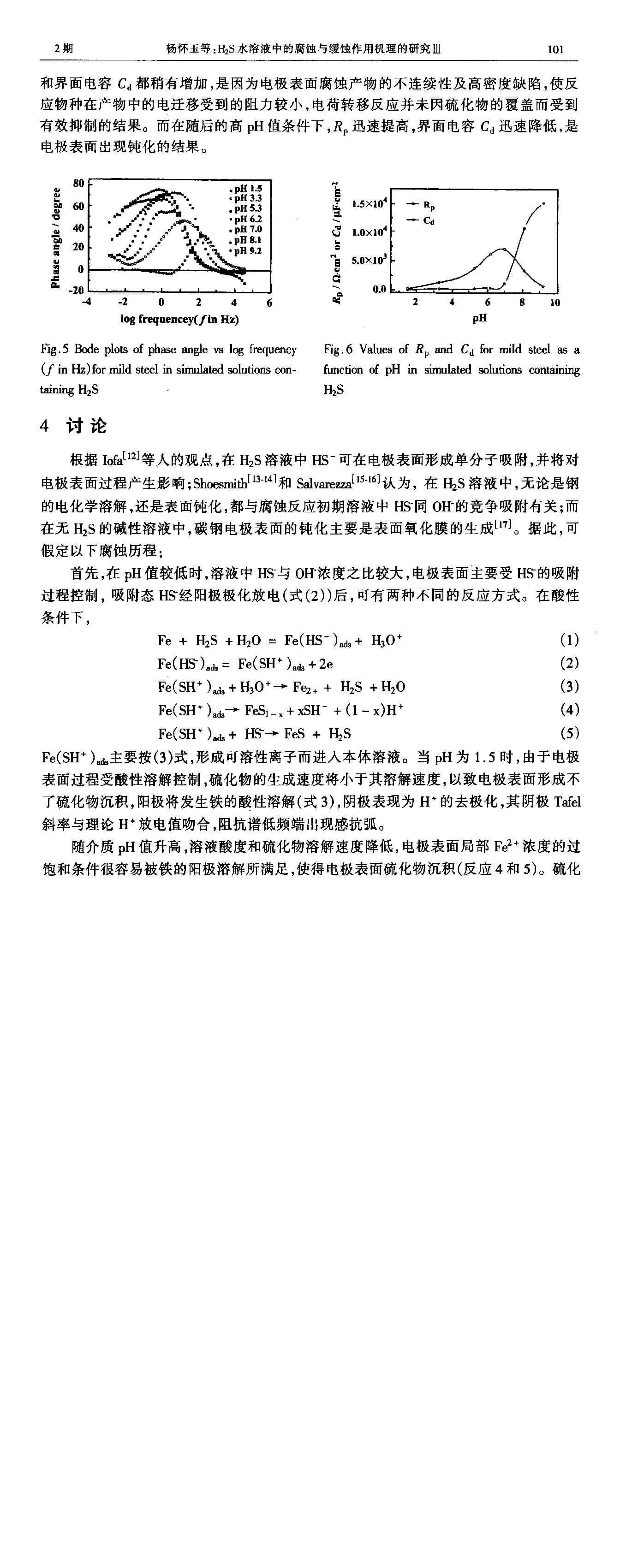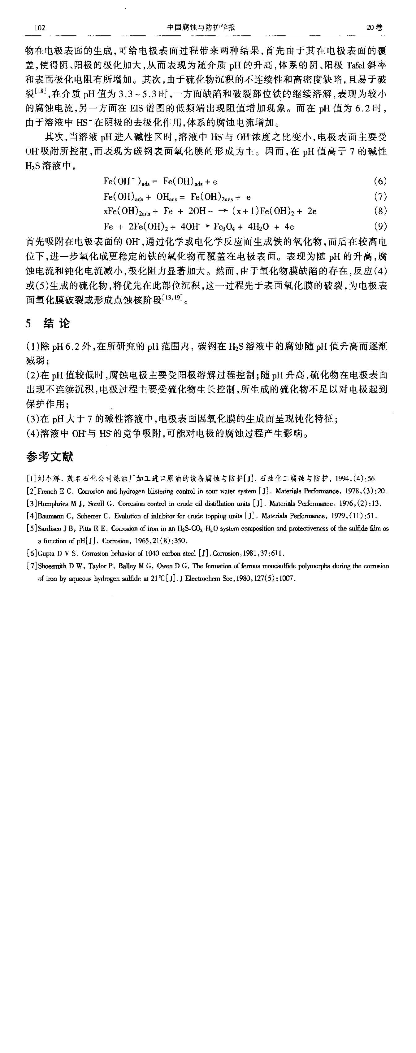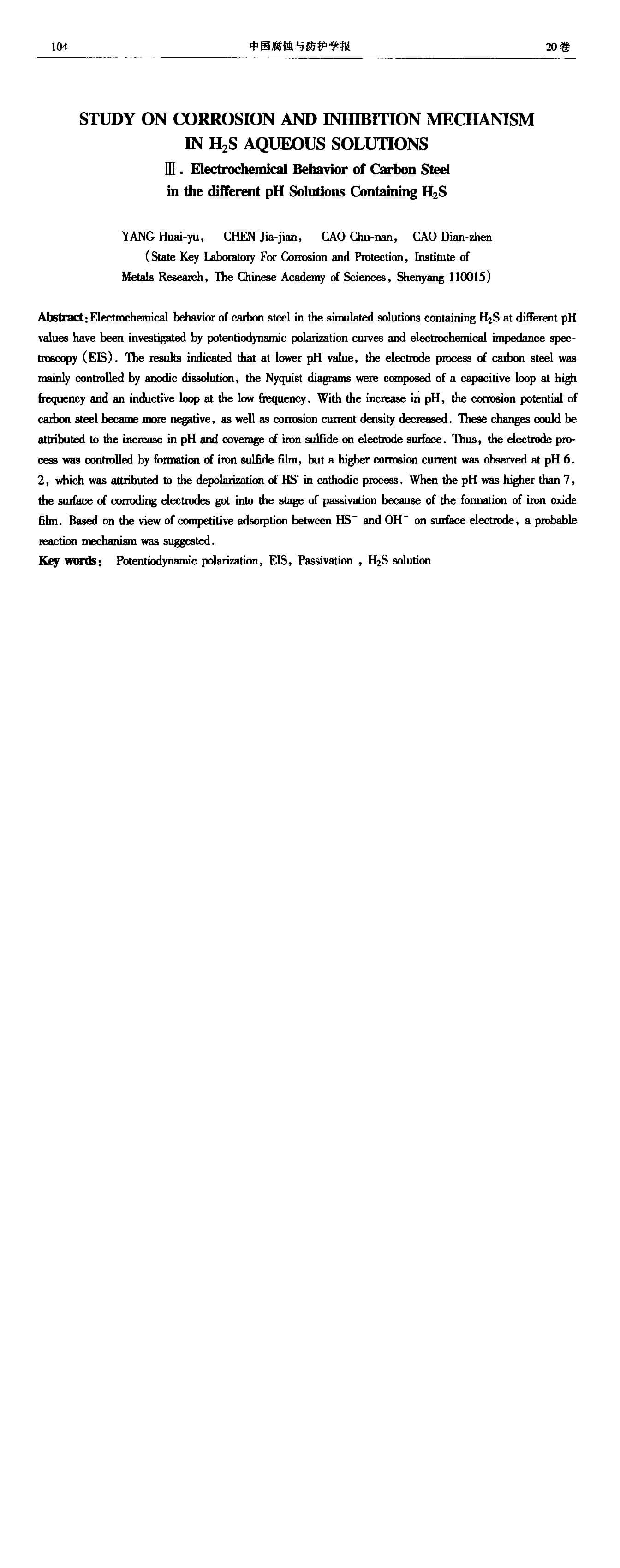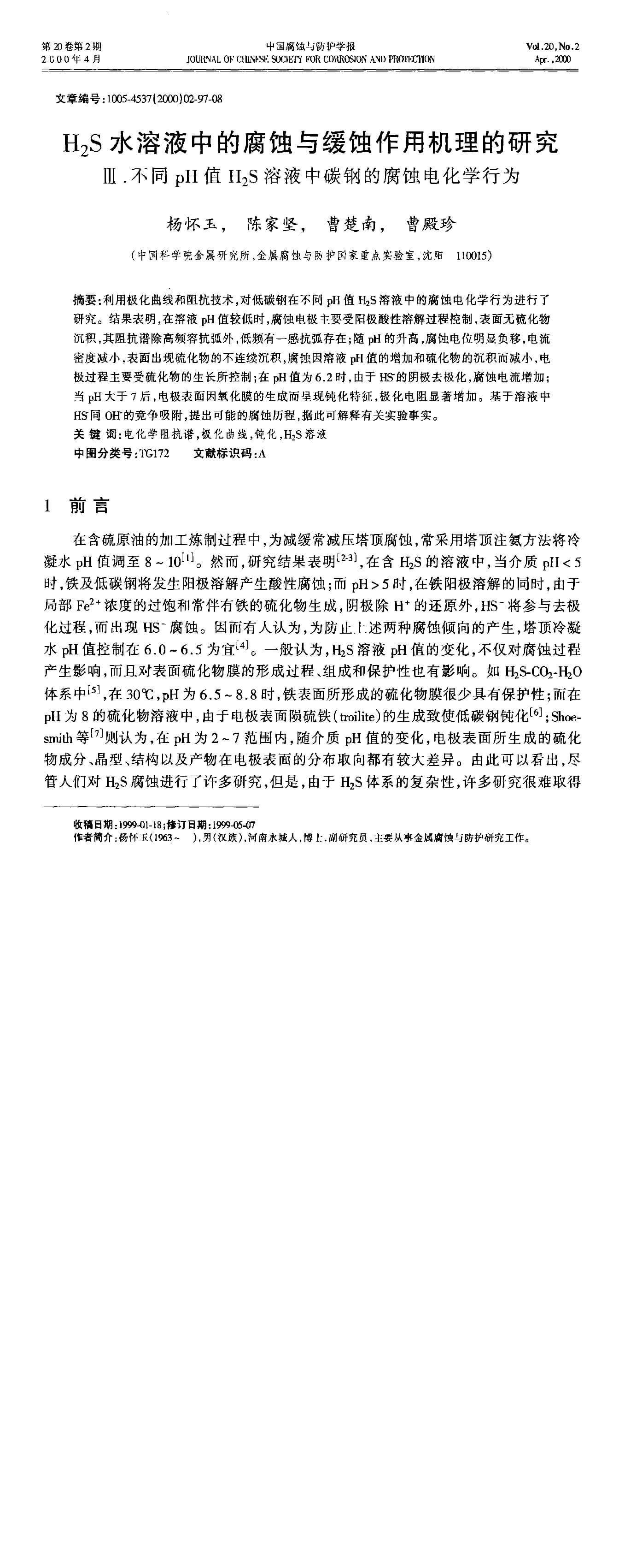 H2S水溶液中的腐蚀与缓蚀作用机理的研究 Ⅲ.不同pH值H2S溶液中碳钢的腐蚀电化学行为