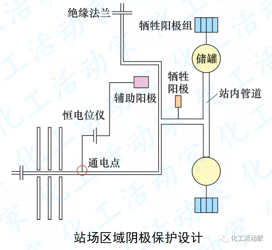 一般来说,由于站场内储罐多、管道纵横交错,并且区域相对封闭,因此在站场内多采用牺牲阳极+强制电流共同的阴极保护方式。
