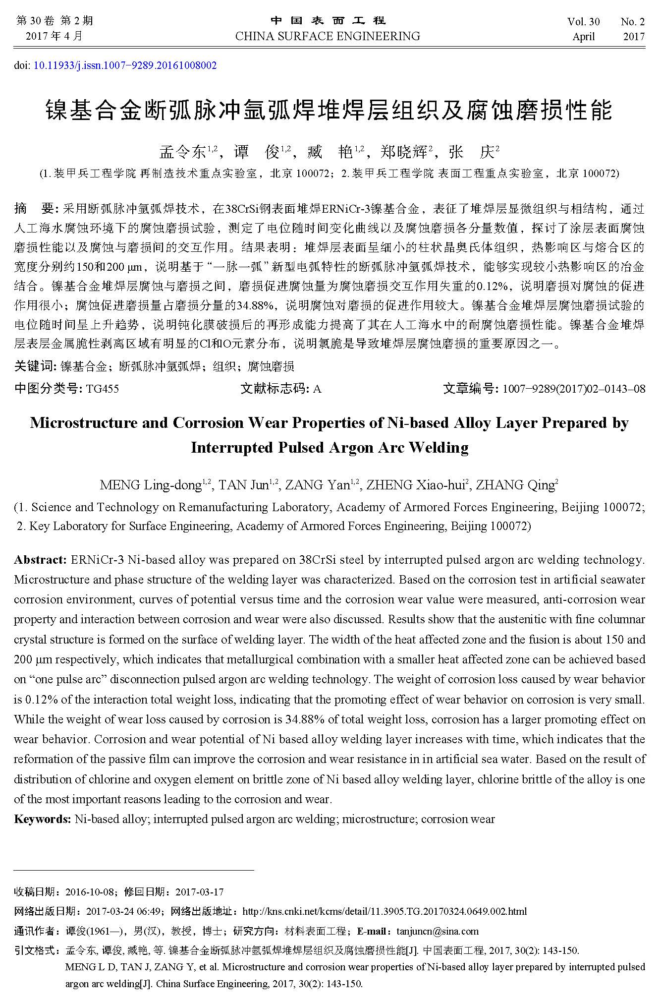 2021-08-16 13:54:59 作者:孟令东,谭俊,臧艳,郑晓辉,张庆 来源:中国表面工程 分享至: